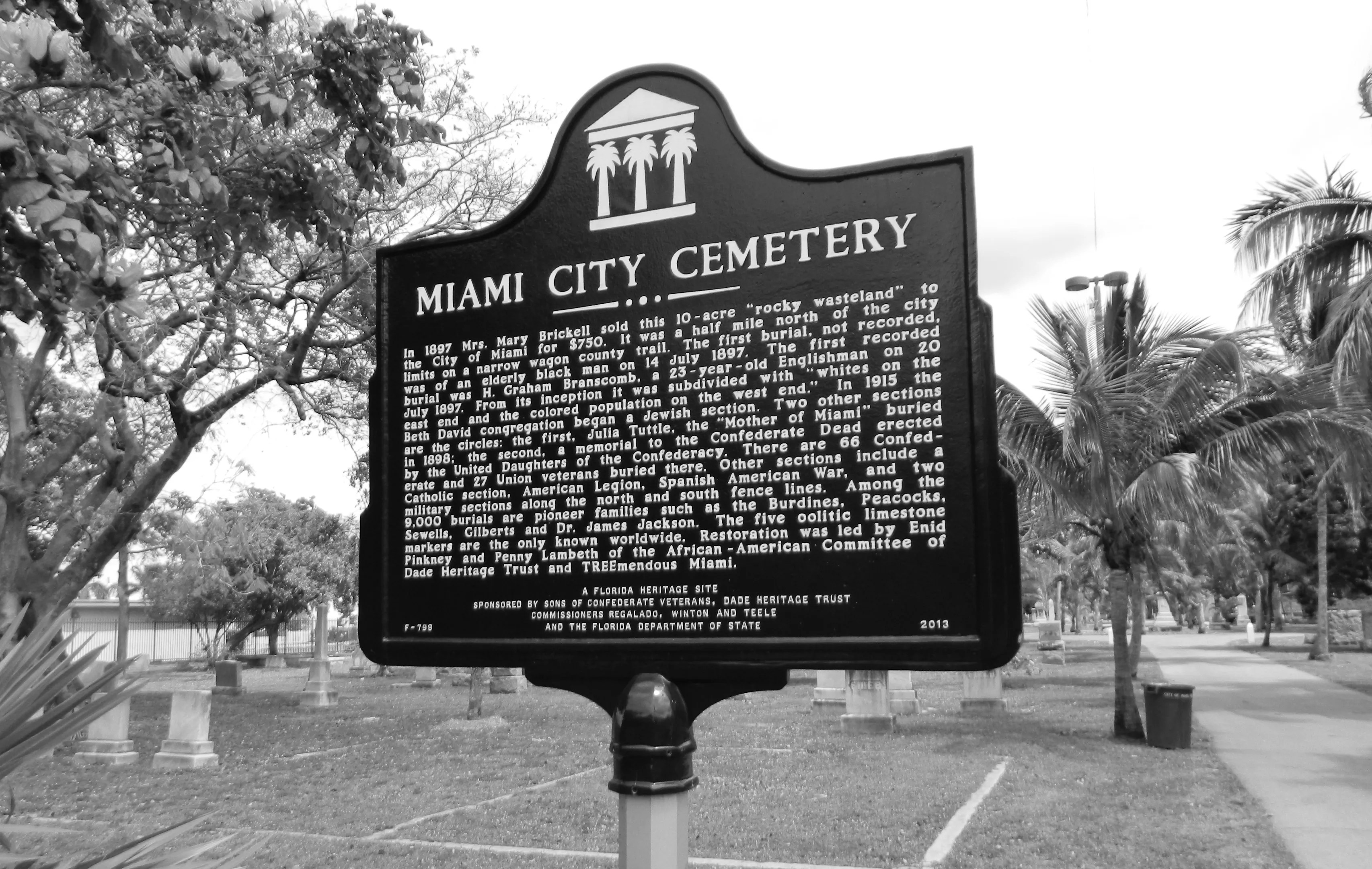 10. Coconut Grove Cemetery. Known currently as the Charlotte Jane Memorial Park Cemetery and formerly as the Coconut Grove Bahamian Cemetery, this graveyard is a burial site for many members of the area’s African-American and Bahamian residents. The graves are aboveground, a common practice for areas that flood. According to HistoryMiami, the woman in the photo, community activist Esther Maye Armbrister, petitioned the city to create historic markers for the cemetery. Armbrister passed away 20 years ago at the age of 81.