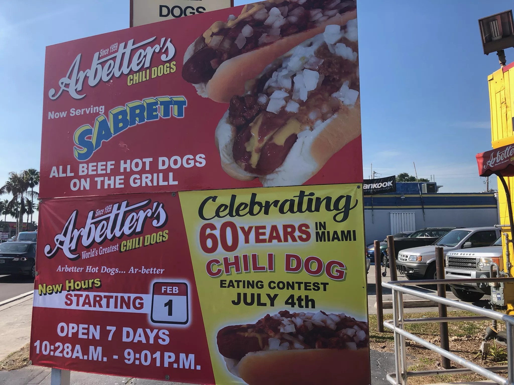 Arbetter’s Hot Dogs. 8747 Bird Rd., Miami; 305-207-0555; arbetterhotdogs.com. Sunday through Thursday 10:30 a.m. to 8:30 p.m., Friday and Saturday 10:30 a.m. to 9 p.m.