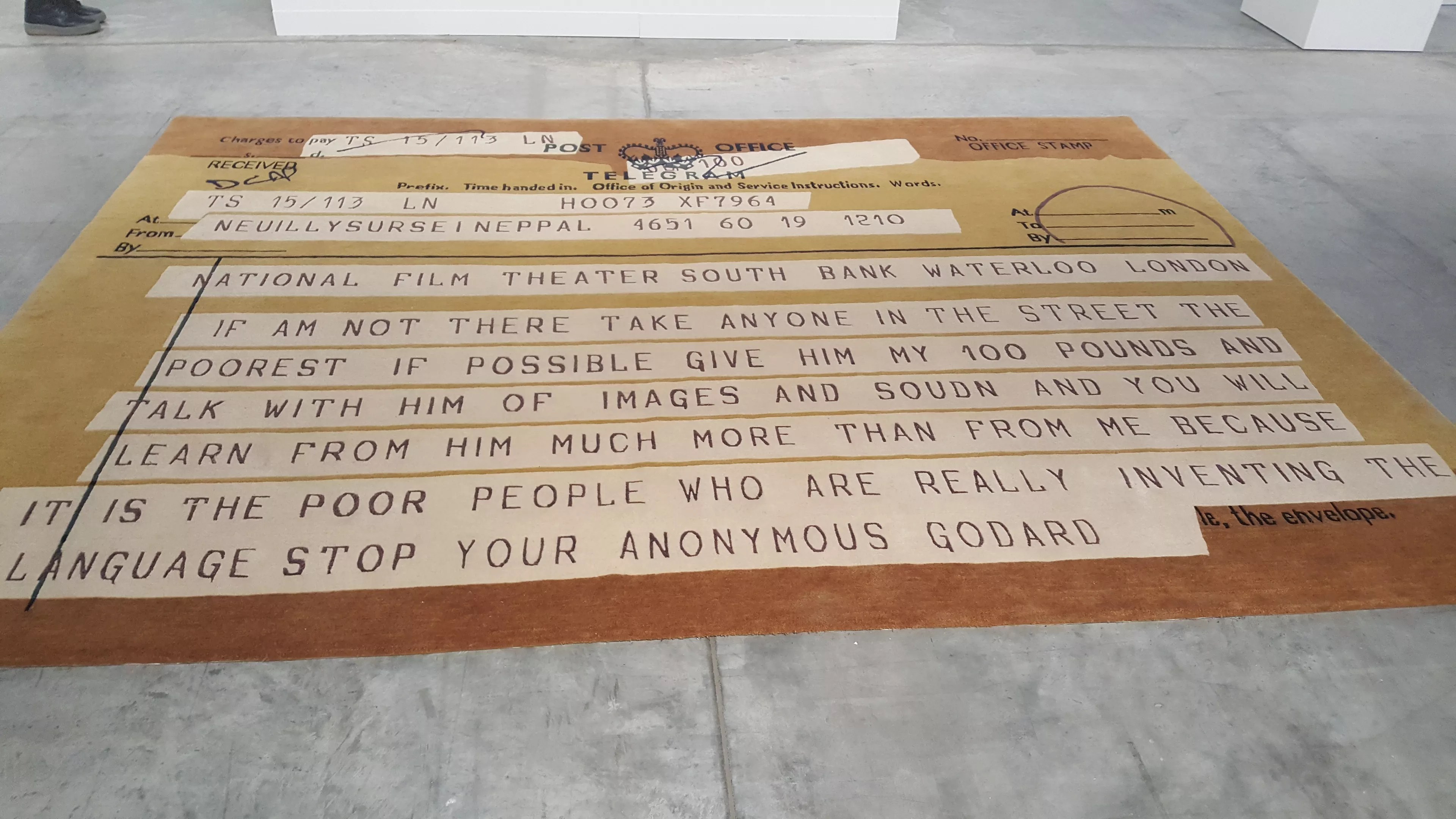 That isn’t to say the convention center is bereft of blatant resistance. Rirkrit Tiravanija’s canvas displays a pointed message in block letters: “RICH BASTARDS BEWARE.” Elisabetta Benassi’s re-creation of a telegram from Godard tells a British film society to replace him with “anyone in the street” for a lecture because “it is the poor people who are really inventing the language.” A Betty Tompkins painting has a message seemingly directly for the world of Basel itself: “The only way you will make it in the art world is on your back.”