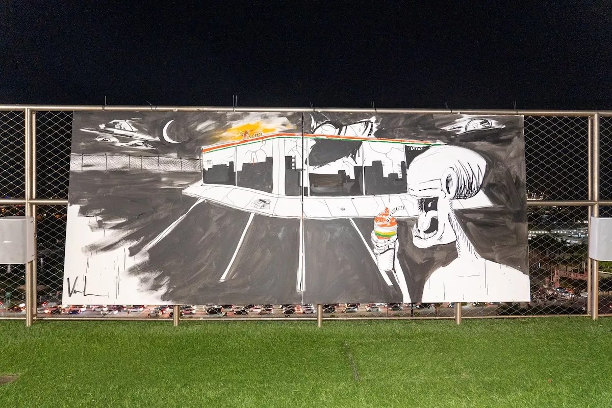 Feeding off the artists’ adrenaline and fueled by Blue’s DJ set, the crowd broke out in a dance circle while others began a raucous “Secret Walls” chant. The energy invigorated the artists, inspiring Butler to include the crowd in his piece. By contrast, Van Lew’s trippy artwork channeled what a space-age 7-Eleven franchise might look like, prominently featuring an alien enjoying a Slurpee.