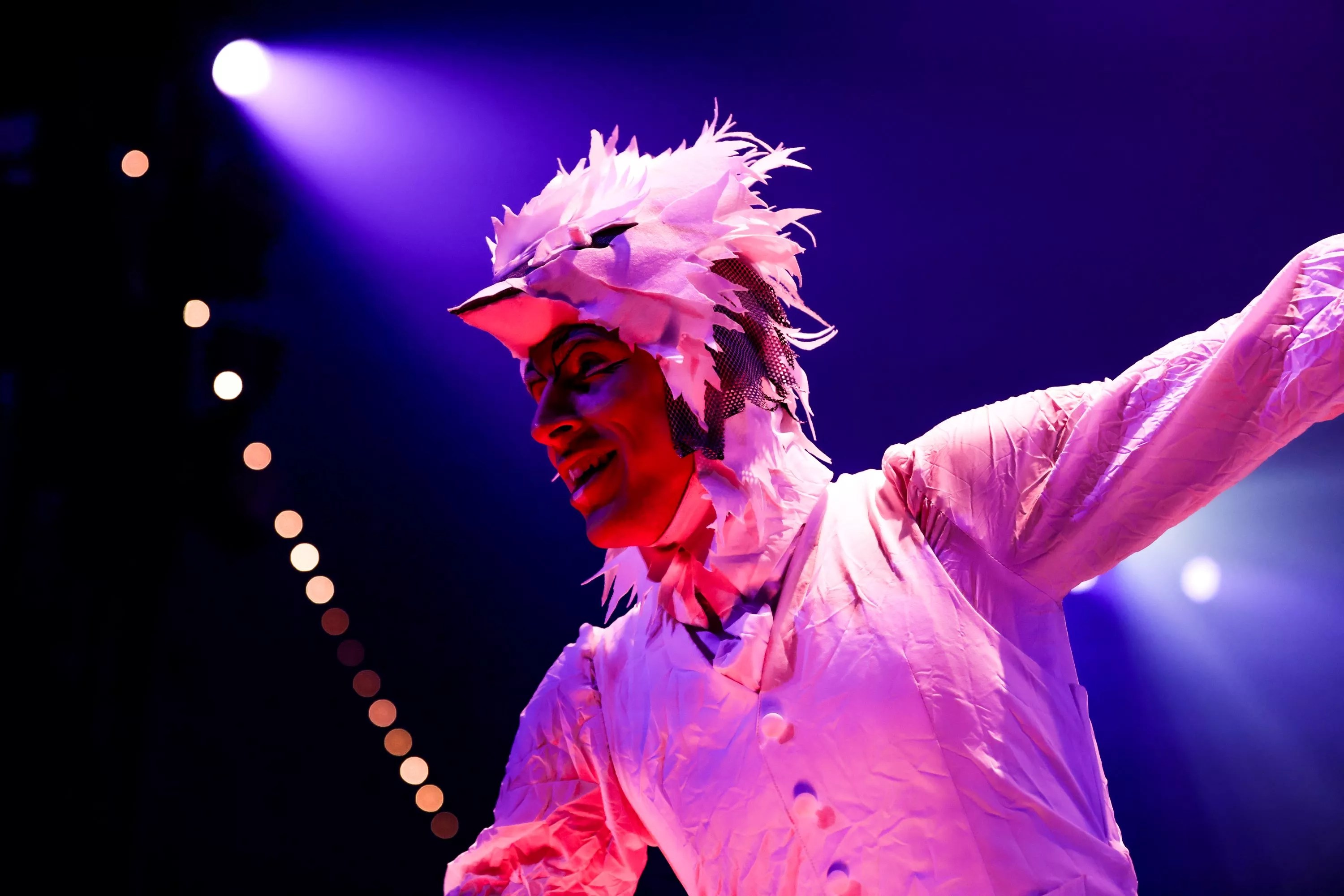The performers wear modern vests, long coats, and tailored suits that one might wear on their way to the office, only these stylish outfits are white and look like they’re made of crumpled paper. To distinguish the humans from the animal characters in the show more easily, the humans’ white outfits have a splash of color while the all-white animals wear headgear. The show’s six onstage vocalists – the most singers ever for a Cirque du Soleil show – wear all black.