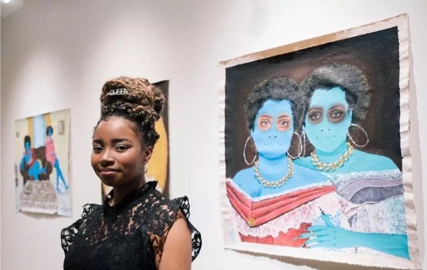 Moore’s work is evocative and intimate. The people in her art – largely Black women with natural hair, and some of them with bright blue skin – are shown living their daily lives on couches and at hair salons, or against the backdrop of the Bahamian flag. Many of her paintings bring in mixed-media elements, making expert use of three-dimensional objects and other textiles. Coming from someone who has been acknowledged with multiple awards and scholarships, Moore’s work finds its strength in its artistic reflections of the world.