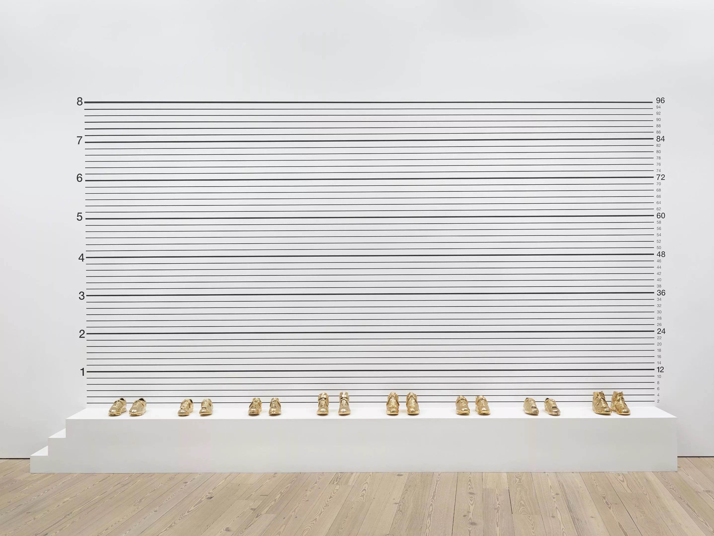 “At that moment in the early ’90s, it was relatively new, this idea that sneakers were this valuable thing that people would steal off people’s feet,” Sirmans says. “So then Gary, taking those kinds of shoes and bronzing them, like we used to do with little kids when they have their first shoes, it’s this way of kind of memorializing it, this way of kind of giving it some patina of longevity, because otherwise we just buy new shoes and throw them away. But in this case, it’s also then positioned into this lineup space, which is a kind of commentary on the lack of an actual body that’s attached to these shoes. So, are we actually considering a person? No, we’re putting the commodity, this shoe, above the person, and then we use the lineup as the backdrop. And so it’s also playing into the idea of crime – how did someone get these, and why is it something that somebody would actually commit a crime for?”