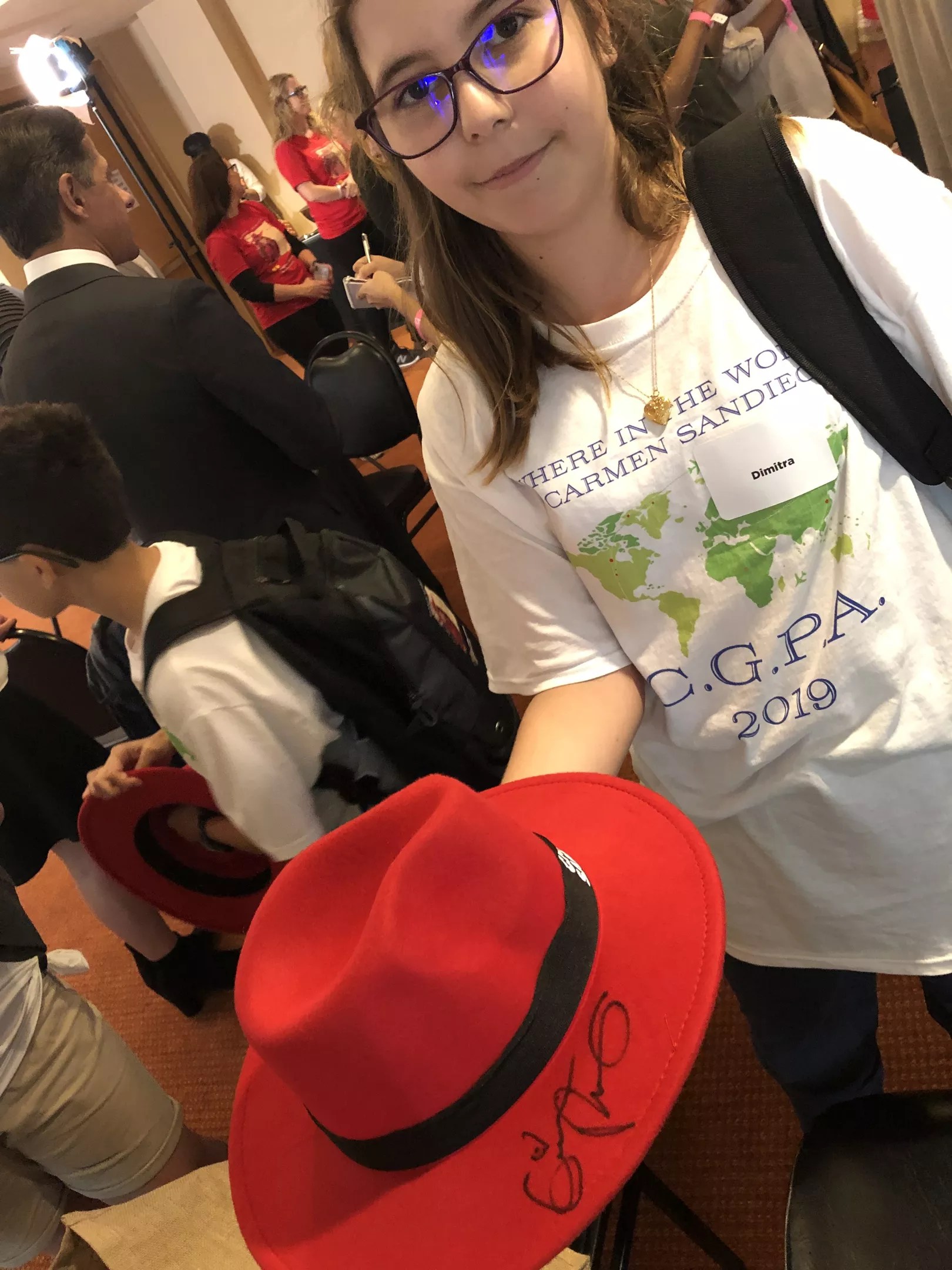 A student shows off her Carmen Sandiego hat, signed by Rodriguez.