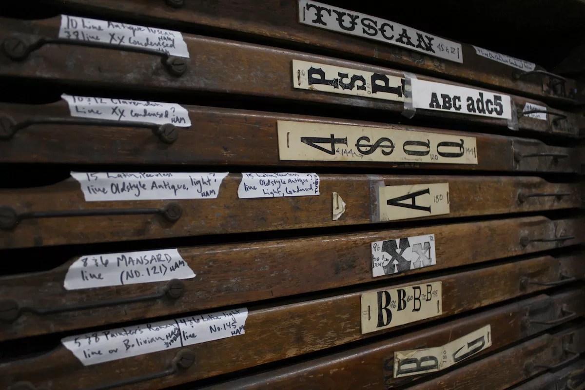 The letterpress room is separated by IS Project’s massive collection of antique lead and wood types housed in antique type cabinets.