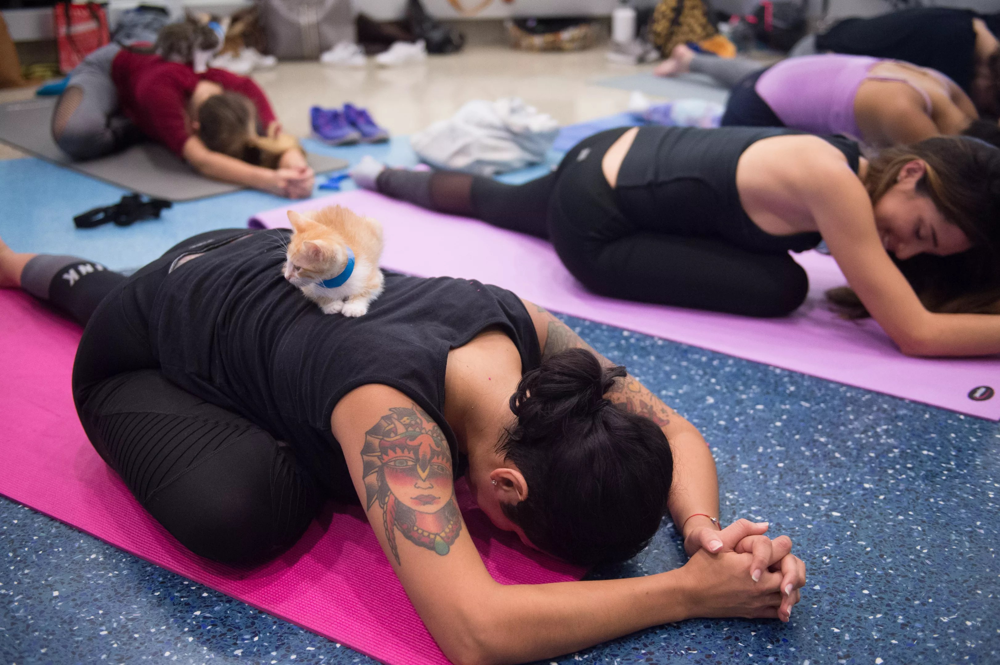 After the class concluded with the group namaste, not a single person wanted to leave right away. Toward the end of the class, those who felt a little timid practicing the poses enjoyed the comedic relief the kittens provided. “I fell in love with the cats, and I fell in love with yoga!” proclaimed a young woman who practiced yoga for the first time at the event. “It was difficult, but I think it was really good, and the teacher was amazing. Although the cats were a little bit distracting sometimes, when I got tense, I would hear the cat sounds and I would start to relax.”