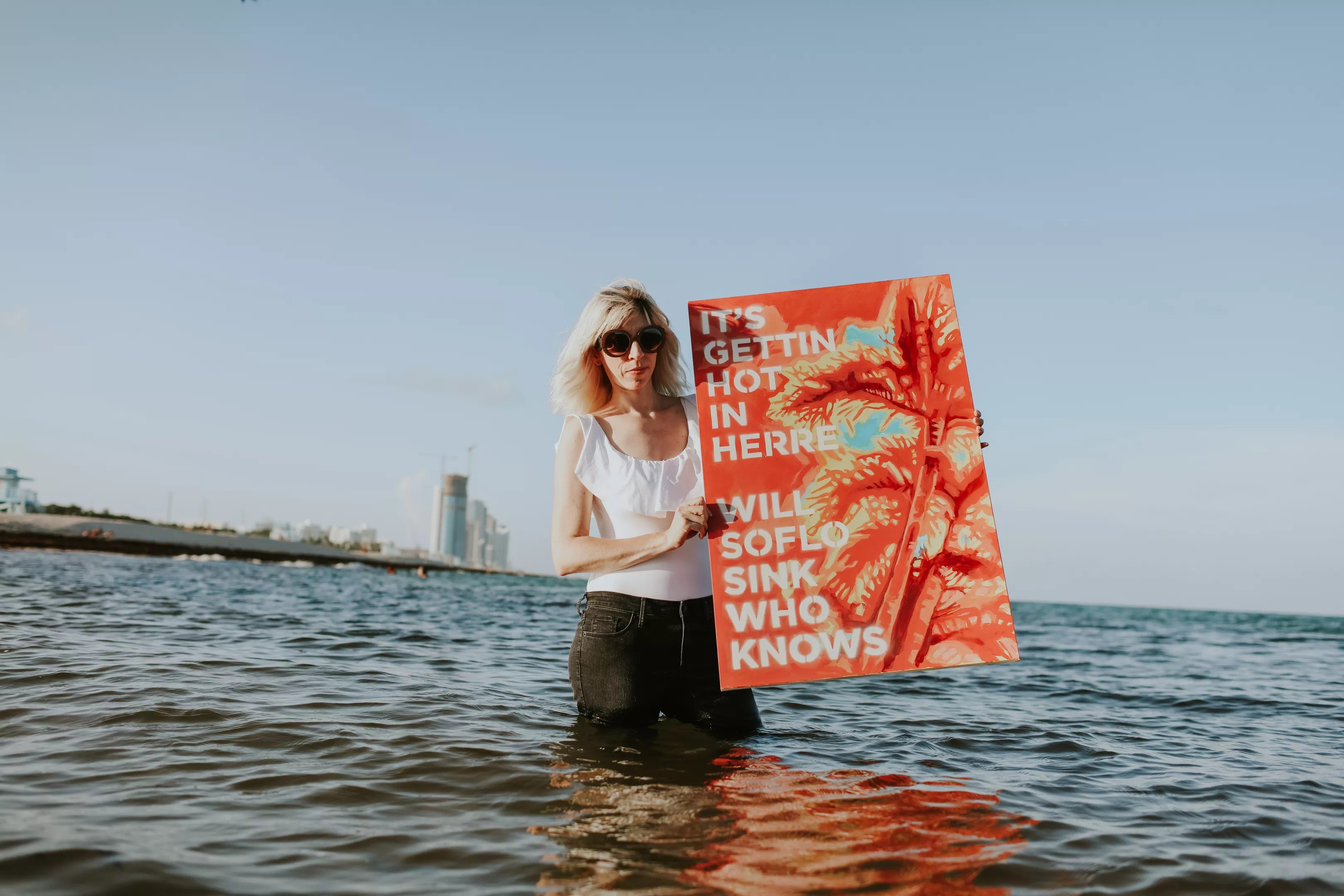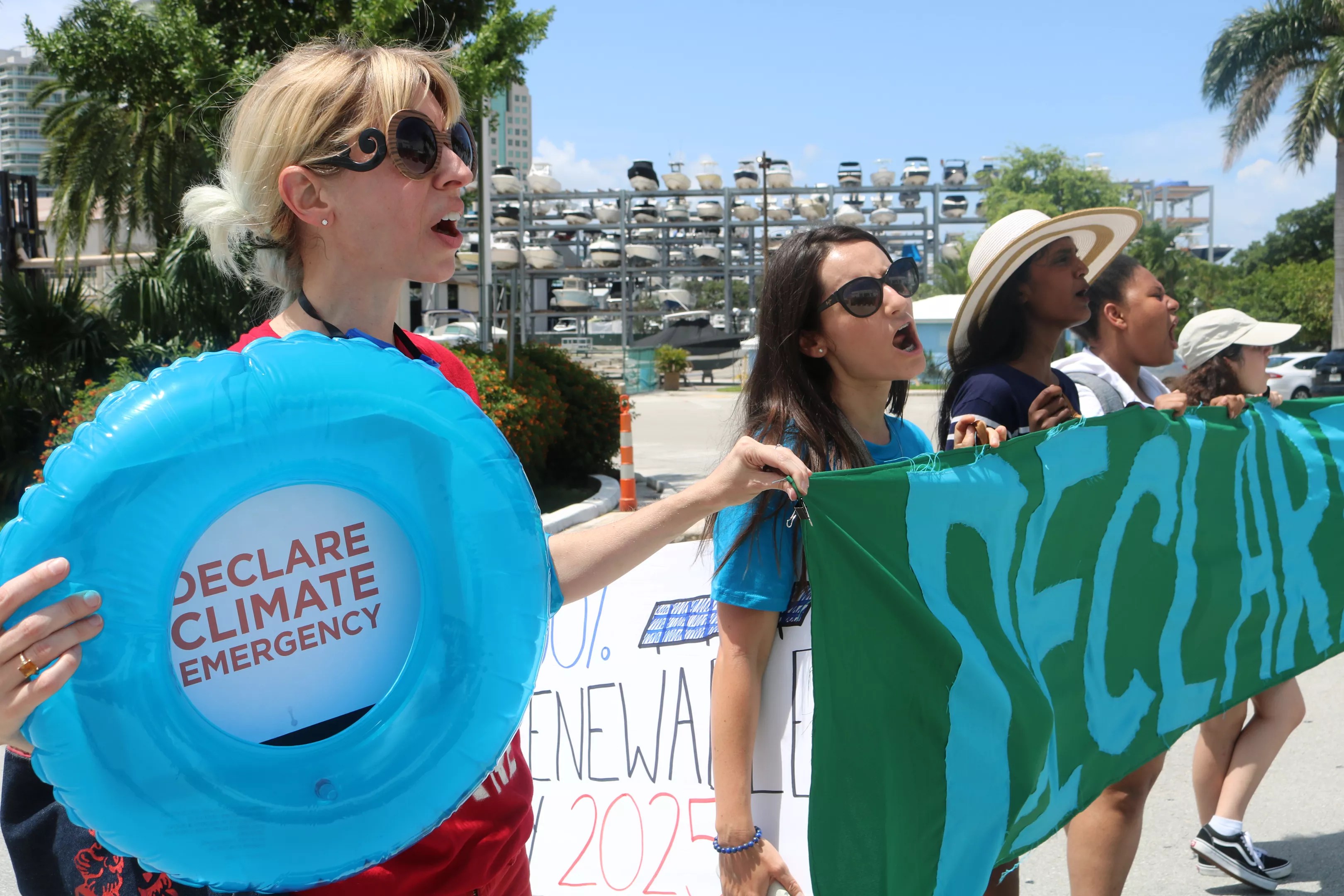 Last week, on a blistering Friday afternoon, Oliva’s hand-printed red T-shirt read, “It’s gettin hot in herre. Will SoFlo sink? Who knows?” Her torso and arms were adorned with aqua-blue pool floaties as she gripped an oversize banner alongside a dozen other protesters in front of Miami City Hall. Their demands were clear from the chant they shouted in unison: The city of Miami needs to declare a climate emergency.