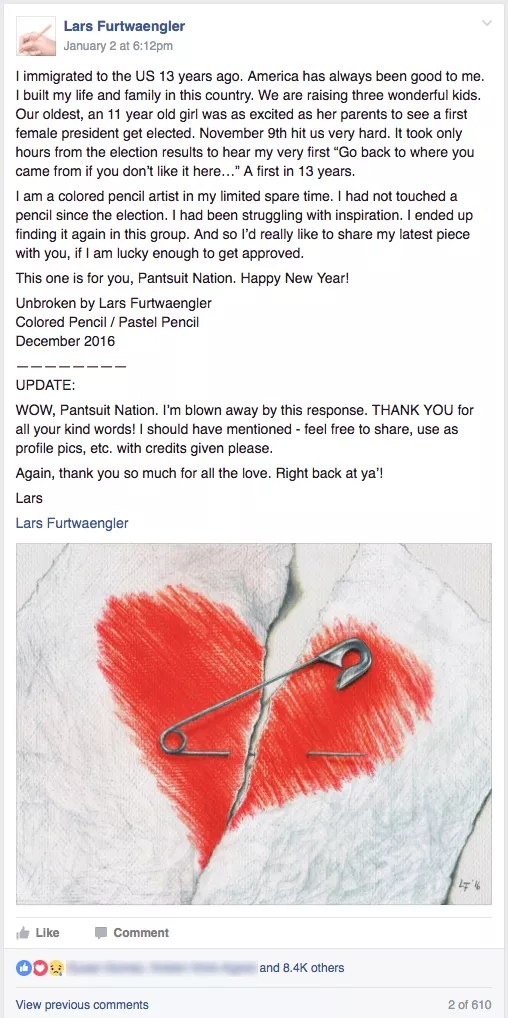 Furtwaengler believes the popularity is due to timing and empathy. “People share my heartbreak,” he says. One comment on the post quotes Carrie Fisher’s words – controversially repeated by Meryl Streep at the Golden Globes – “Take your broken heart; make it into art.” The simplicity of the ripped heart and safety pin touched the feelings of the members of Pantsuit Nation. Another comment read, “I have taught art… for 21 years, and think I have not seen a more effective message delivered by simple imagery.” One commentator even said the image might soon become her first tattoo.