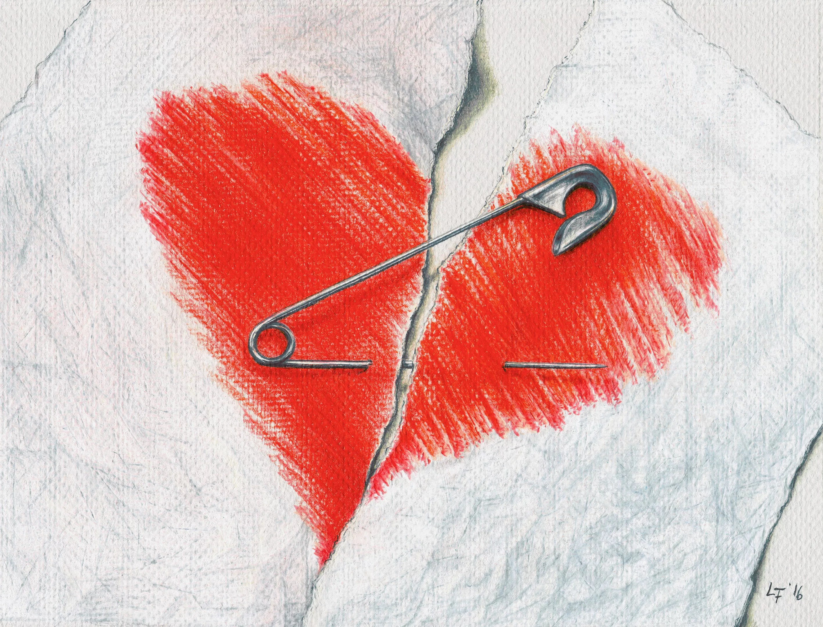 Furtwaengler was typically quite prolific in his art, creating on average one photorealistic colored-pencil drawing per month. But in the days after the election, he hadn’t drawn a thing; he couldn’t find the inspiration after what he describes as a crushing loss. That dry spell broke after Christmas, when Furtwaengler sat down for an intense 12-hour drawing session. His piece, titled Unbroken, is a colored-pencil-and-pastel drawing of a crumpled, torn piece of white paper with a scribble of a vermilion heart. A large open safety pin holds the two halves of the heart together. (The safety pin became a symbol of tolerance after the election, when people began wearing them to express support for women and minorities who were the targets of violence after Trump’s election.)