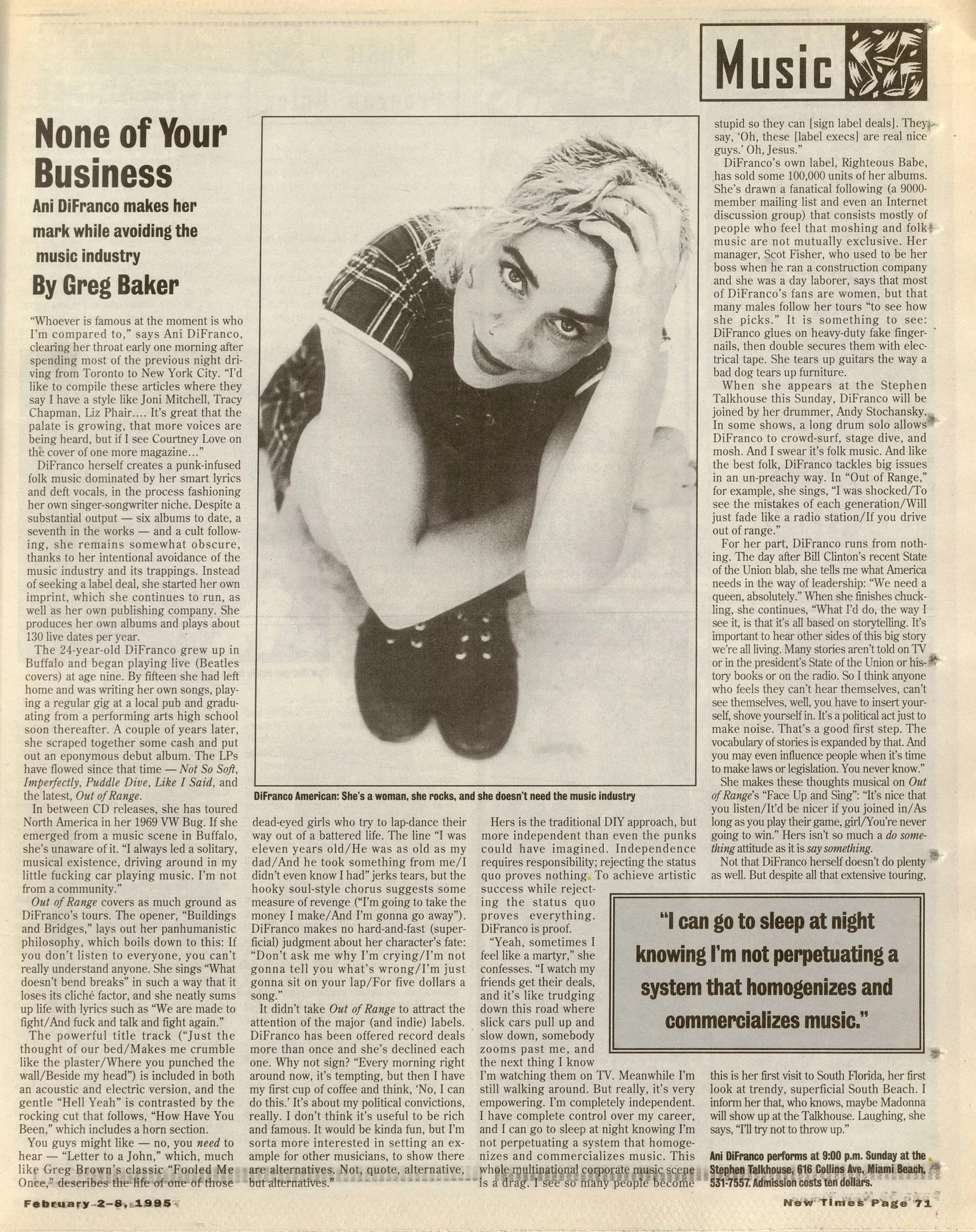 “Whoever is famous at the moment is who I’m compared to,” Ani DiFranco told music editor Greg Baker. “I’d like to compile these articles where they say I have a style like Joni Mitchell, Tracy Chapman, Liz Phair…. [I]f I see Courtney Love on the cover of one more magazine….” Tom Austin’s weekly “Swelter” column as it appeared in the February 2-8, 1995, issue of New Times Miami New Times image