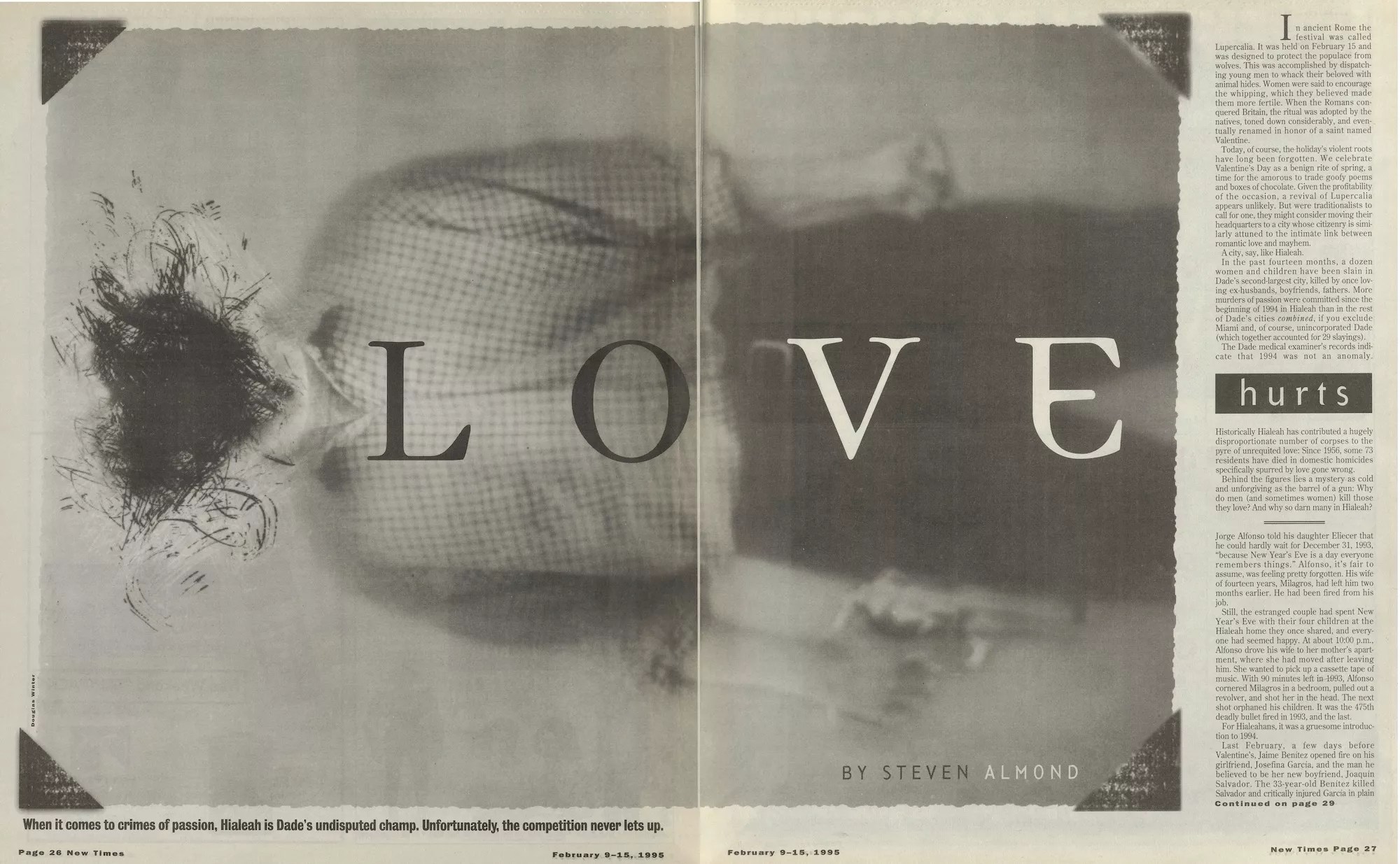 “The Dade medical examiner’s records indicate that 1994 was not an anomaly. Historically Hialeah has contributed a hugely disproportionate number of corpses to the pyre of unrequited love: Since 1956, some 73 residents have died in domestic homicides specifically spurred by love gone wrong,” Steve Almond wrote in “Love Hurts” as Valentine’s Day approached in 1995.