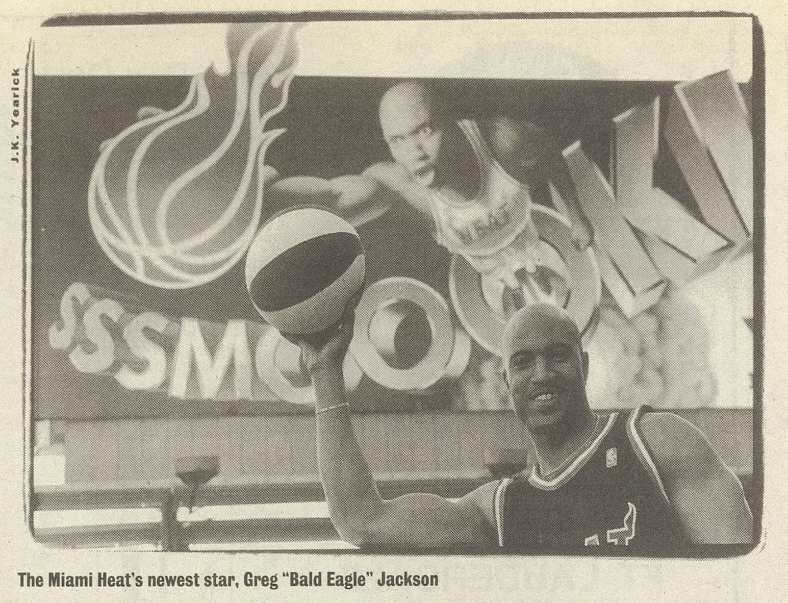 A 1995 photo of Greg “Bald Eagle” Jackson, posing in front of the Miami Heat billboard he modeled for