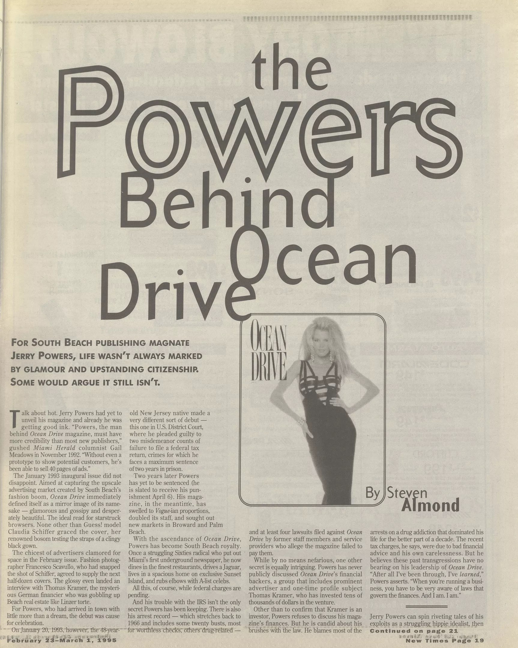 The opening of a New Times feature story profiling Ocean Drive founder Jerry Powers, published in the February 23-March 1, 1995, issue of the weekly paper