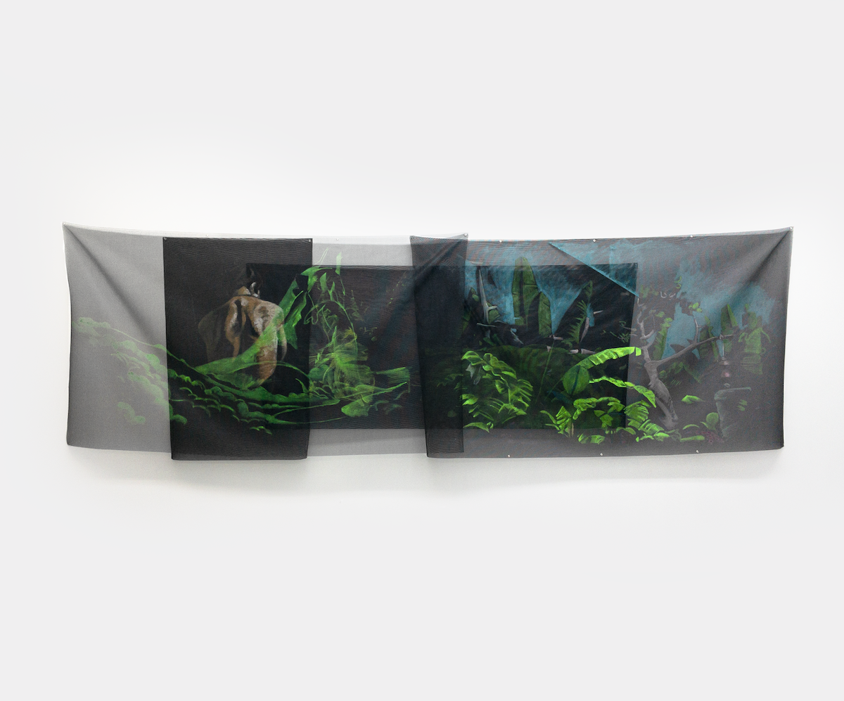 Lenguaje, a mixed-media work by Joaquin Stacey-Calle created using pool screens. The artist is one of eight featured in Homework’s “Summer School” group show.
