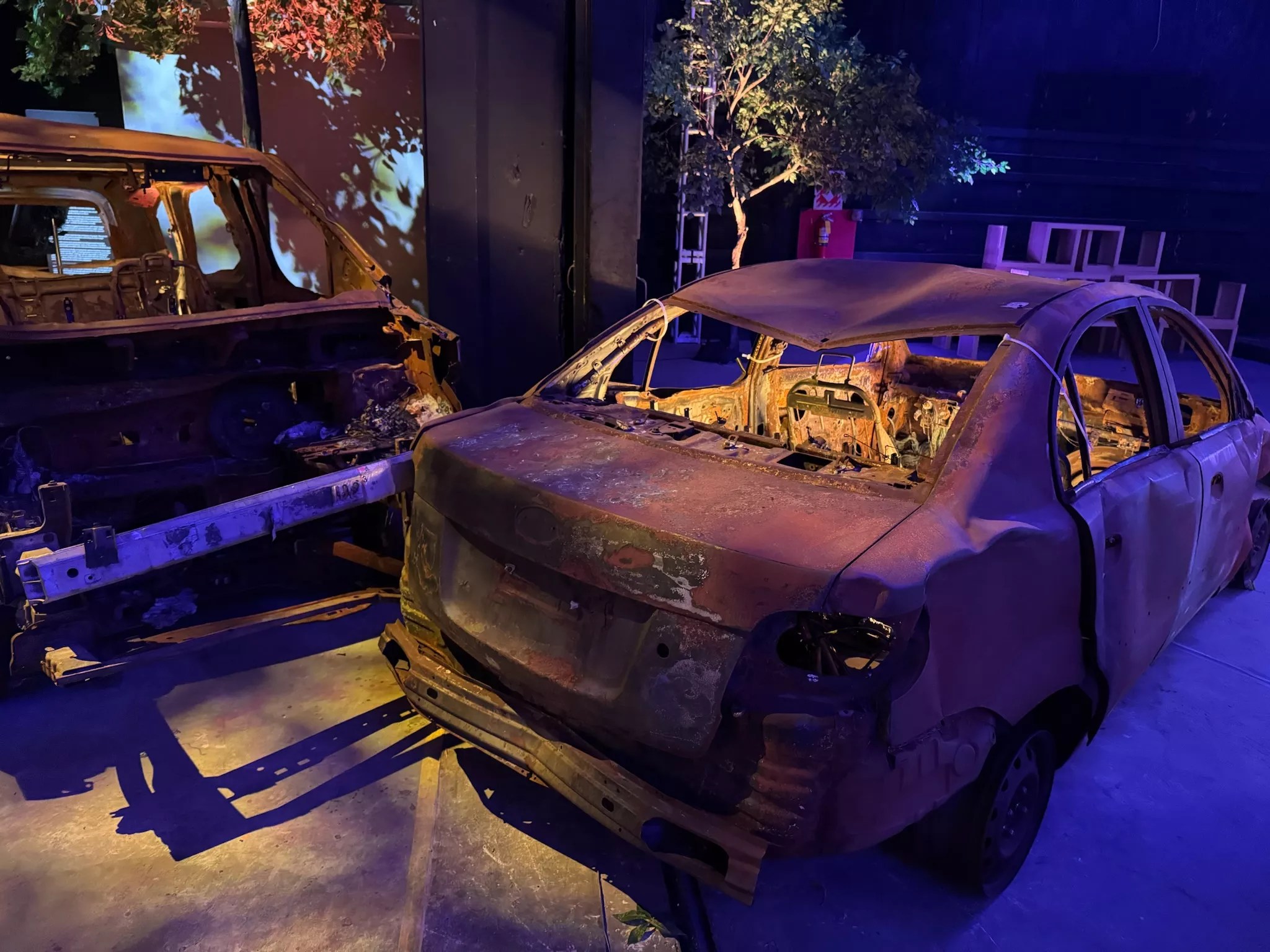 Other parts of the space feature the burned-out cars of partygoers and a re-creation of the public bomb shelter in which people were slaughtered while they tried to evade the terrorists.