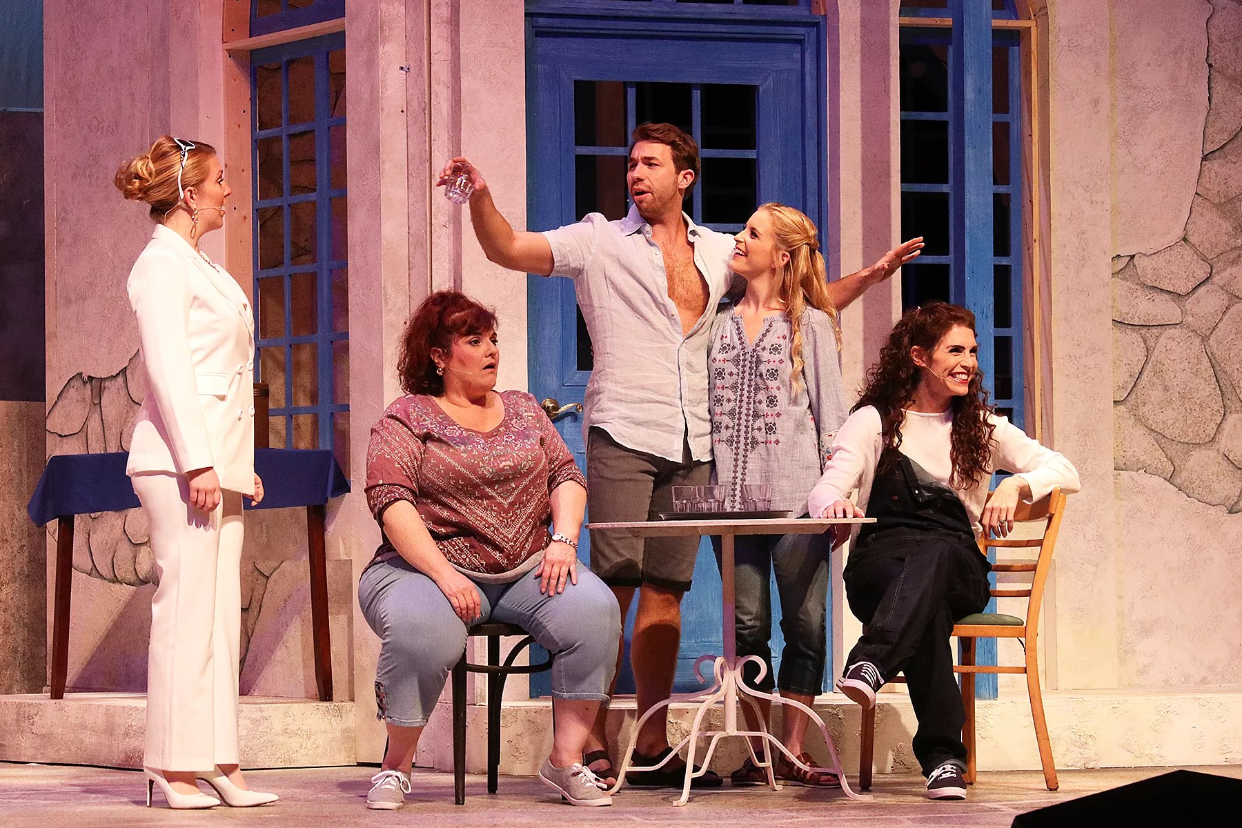 Set designer Sean McClelland, set dresser Jodi Dellaventura, lighting designer Eric Nelson, and costume designer Ellis Tillman create the inviting, sun-kissed fictional Aegean Sea island of Kalokairi, where clothing worn by the buff younger inhabitants tends toward skimpy. Sound designer Shaun Mitchell cranks up the volume so that this Mamma Mia! is part theater and part concert.
