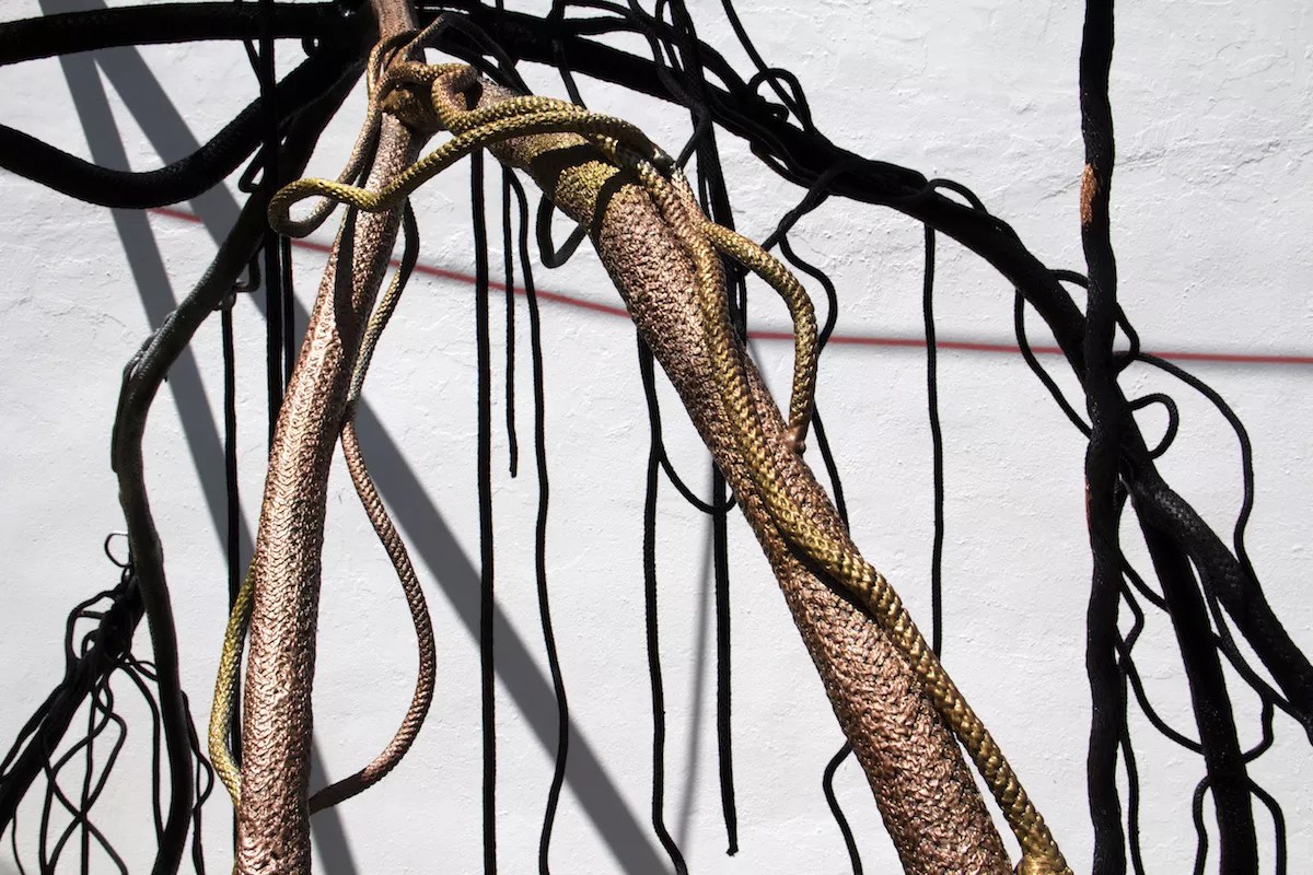 Twisting and turning, a delicately crafted mangrove constructed of rope and steel snakes through the air, impossibly knotted but still unmistakably distinct in its path forward. A red line runs boldly along a gnarled makeshift branch, connecting it with another sapling looming ahead.