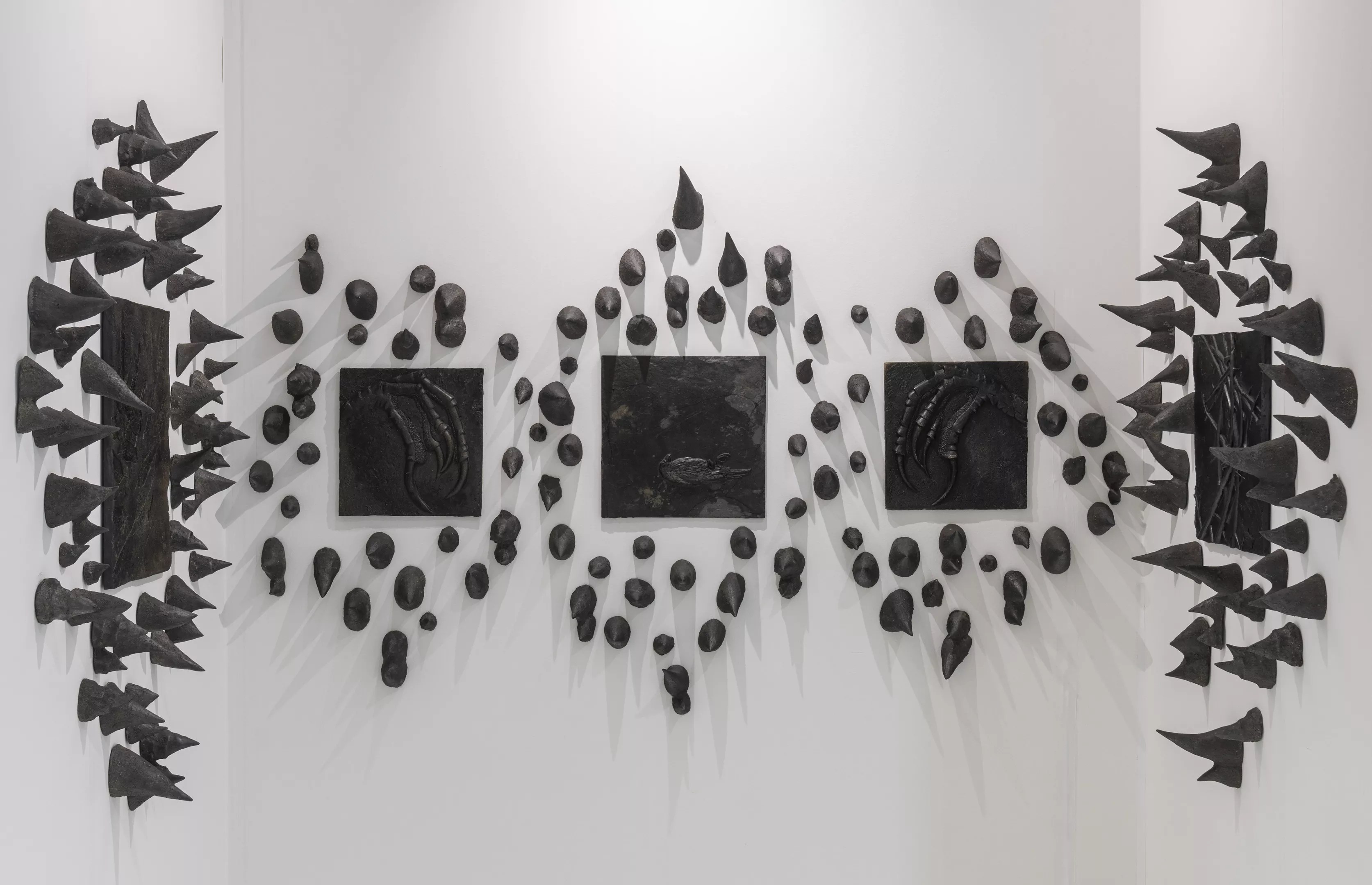 I found myself drawn to some darker works, both in tone and material. Mexico City-based JO-HS Gallery showed a booth by Chavis Mármol with panels depicting fossilized flora and fauna surrounded by spikes resembling the thorns of the ceiba or kapok tree. New York-based Jordan Eagles showed a group of shadowy paintings made from blood and resin at New Directions. Korean artist Woo Hannah showed a pleather sculpture resembling a sci-fi monster straight out of John Carpenter’s The Thing at G Gallery.