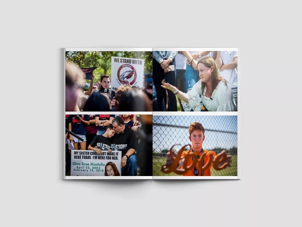 The introduction begins, “As a Marjory Stoneman Douglas alumnus, the Parkland tragedy did not hit close to home. It shattered it.” It ends, “I witnessed the birth of a movement.” The accompanying photo is of students Kelsey Friend and Julia Brighton visiting the memorial of their teacher Scott Beigel, originally published on Vanity Fair‘s website. Another photo in the book appeared both in Vanity Fair and the CNN documentary The Parkland Diaries.