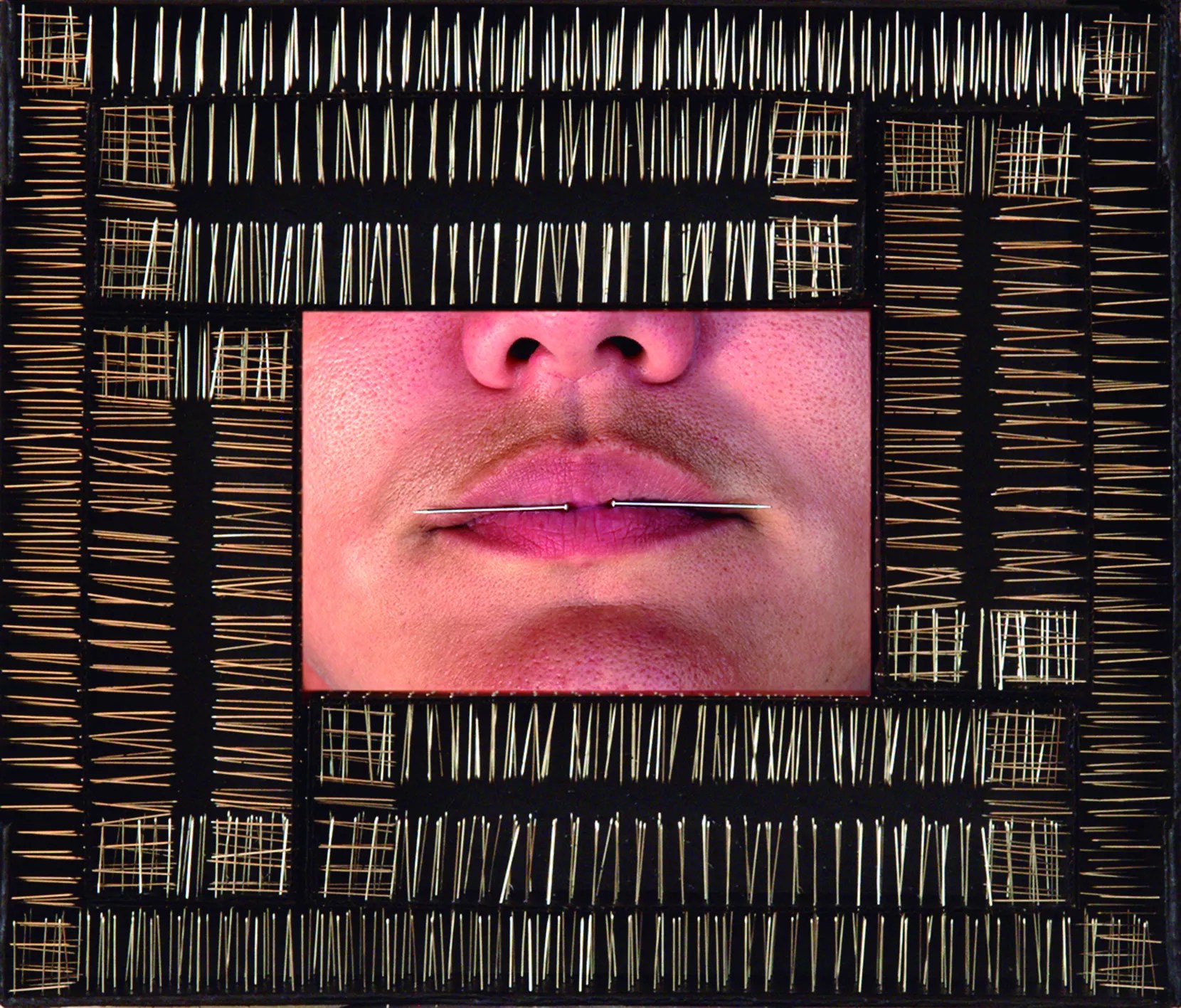 Lidzie Alvisa’s Silencio is a mixed-media piece that combines photography, cardboard, and pins. A close-up image of a person’s face holding two pins horizontally in their lips is framed with a pattern of pins on a black background. In some places, the pins are interwoven and overlapping; in others, they remain vertical and individuated.