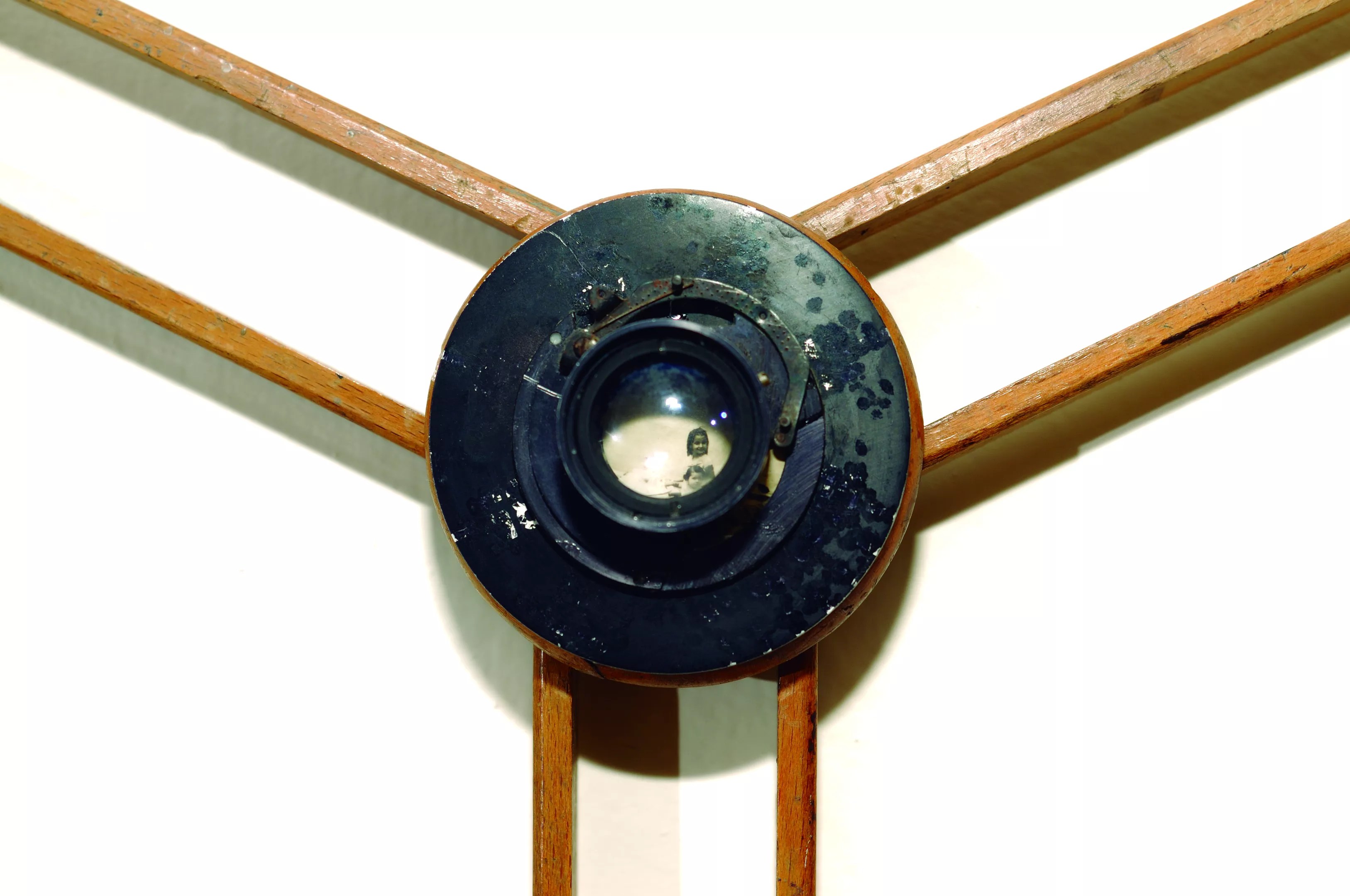 Another work in the show, Jose Manuel Fors’ Tripode, is a tripod made of aged light wood that resembles the legs of an insect. From a distance, the work appears reductive and formal. But look closer into the aperture, and the viewer is confronted with a black and white photograph of a smiling young girl.