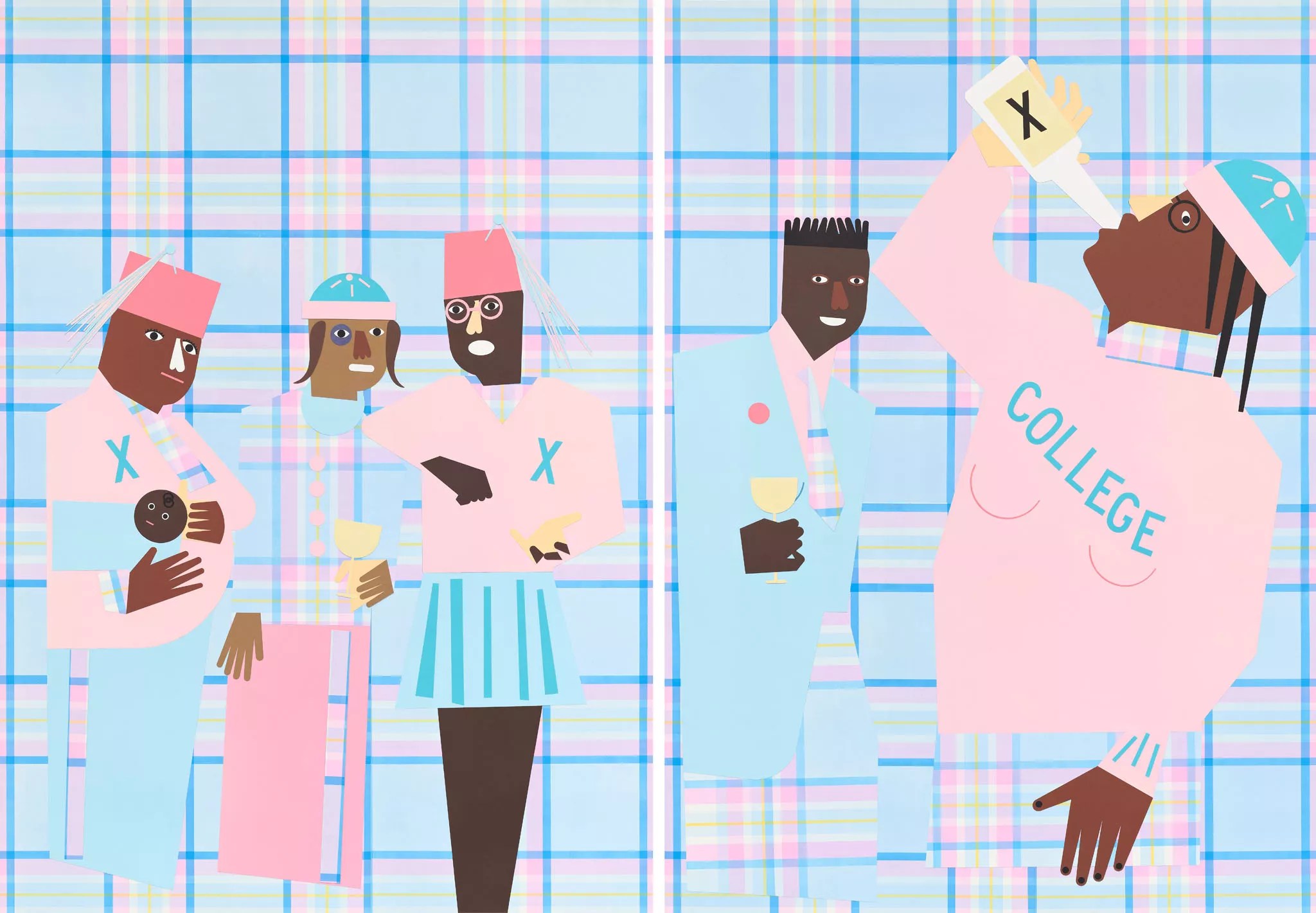 Nina Chanel Abney, Mama Gotta Have A Life Too, 2022. Diptych collage on panel.