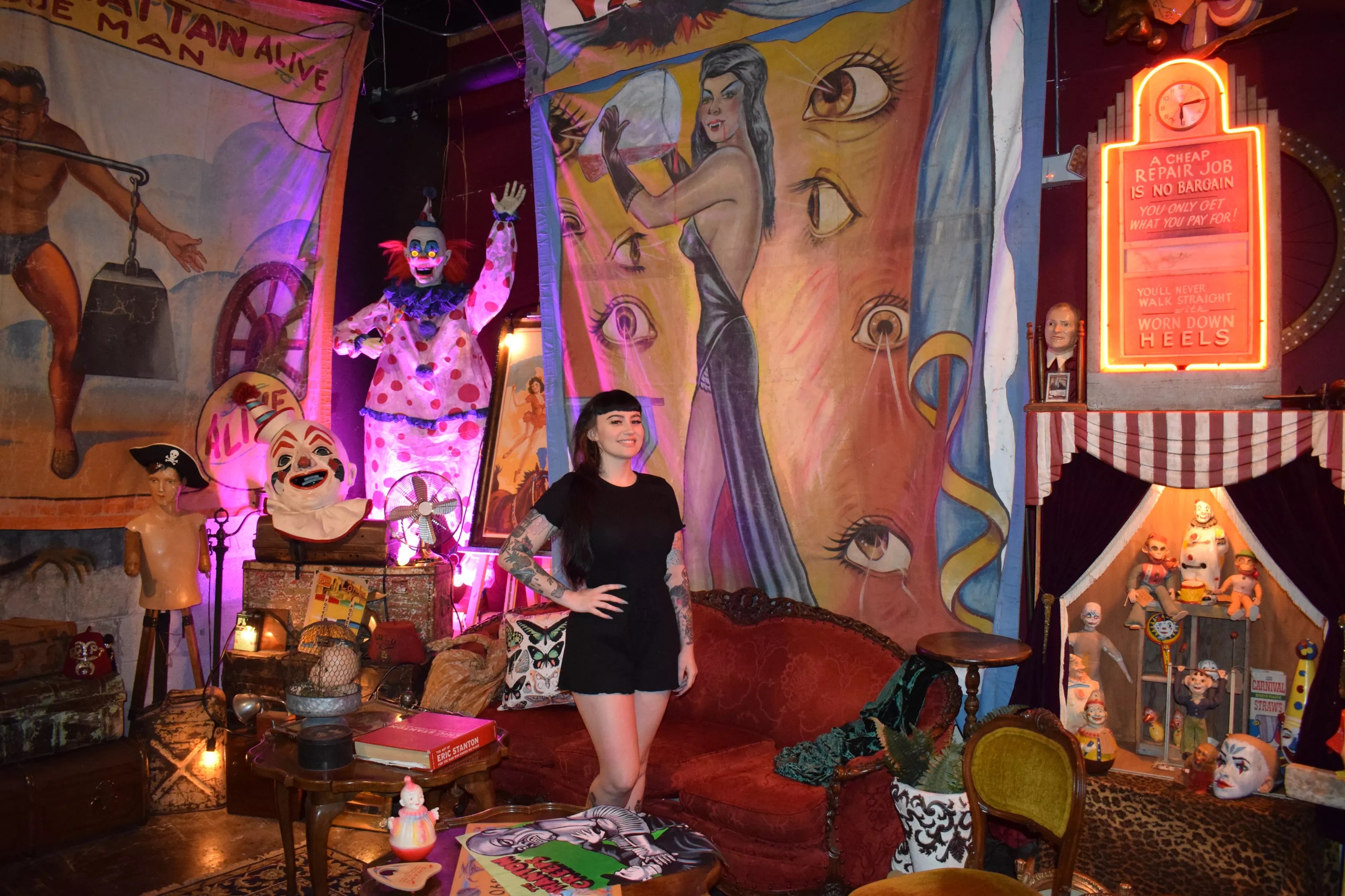 All the objects on display at Old Ghosts come from Nicole and her partner Jackson Valiente’s personal collection, which took a combined 20 years to amass. The duo met after Nicole became a regular client at Kreepy Tiki Tattoos and the neighboring Kreepy Tiki Bar & Lounge. The two hit it off, and Valiente offered her a job at the tattoo parlor.