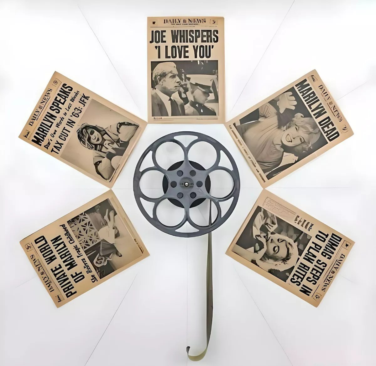 “I bought footage of him on his honeymoon with Marilyn Monroe, and then I bought the New York Daily News’ newspapers from the week that Marilyn died, and I put them together,” says Scholl.