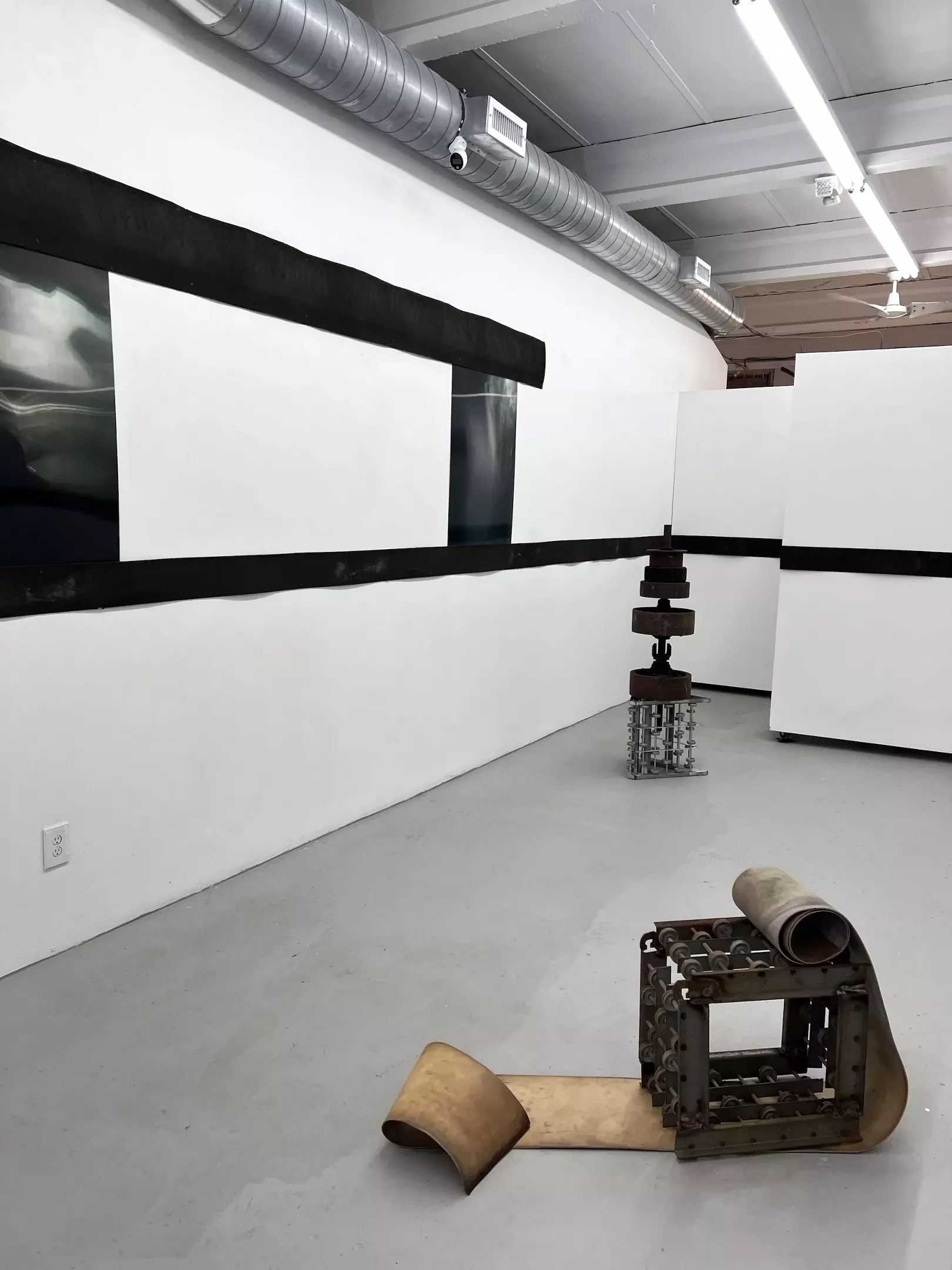 Carter’s newest works line the walls. They are lenticular photographs consisting of several images in each piece, so many that it is nearly impossible to make out any of the individual images. At first glance, only small details, like metal staples or vague shadows, can easily be seen. Further investigations into the entirety of the holographic works, sometimes by shifting side to side in a silly dance, allow viewers to discern from the eerie green, black, and beige coloring some vague images, like the power back of a torso, or a mound of snow. As a child of the early 2000s, something about them reminds me of the McDonald’s holographs that came with a Happy Meal. As a whole, the works seem largely abstracted, and the various images create a dynamic movement that any viewer can project their imagery onto. The burly, worn, deep brown mechanical belts were a curatorial decision to add to the effect of the entire installation, although they are not works themselves. In a serendipitous turn of events, Camargo happened upon them on the side of the road shortly before the opening, a lucky break since Carter had been collecting these belts for quite some time and was never able to find enough belts to install them in an exhibition in this manner.