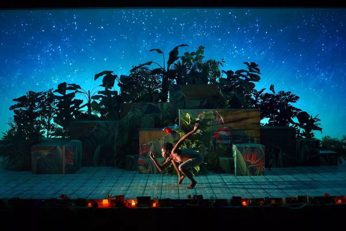 Tony Award-nominated set designer Adam Rigg has created a collection of boxes of various heights to represent Haiti’s countryside and hills, with Tante Ilyana’s mountain projected mountain behind. The boxes are adorned in the style of Haitian paintings, with lush greenery and vibrant flowers, and downstage, a long row of flickering candles and vodou offerings to the gods serves as a reminder of those lost to the living.