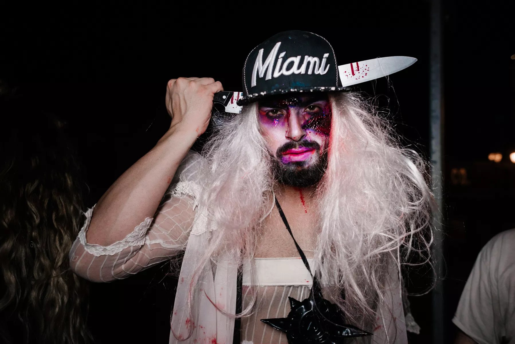 Curated by Miami’s Notorious Nastie, Zombie Prom brought out all the freaks. Because this coveted party hasn’t happened in over ten years, it wasn’t something to miss. Guests lined up at the door either did the bare minimum with fake blood on a white T-shirt or went all out with spine-chilling makeup and shredded costumes with accessories. Inside on the patio sat a blond-haired woman with horns coming out of her head, dark lipstick, and blood dripping down her hands as she held a human heart, nodding her head to the DJ spinning electronic music to warm up the crowd. Things were about to get spooky.