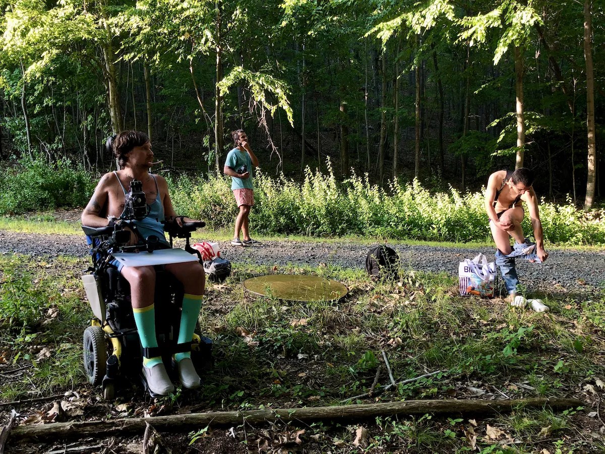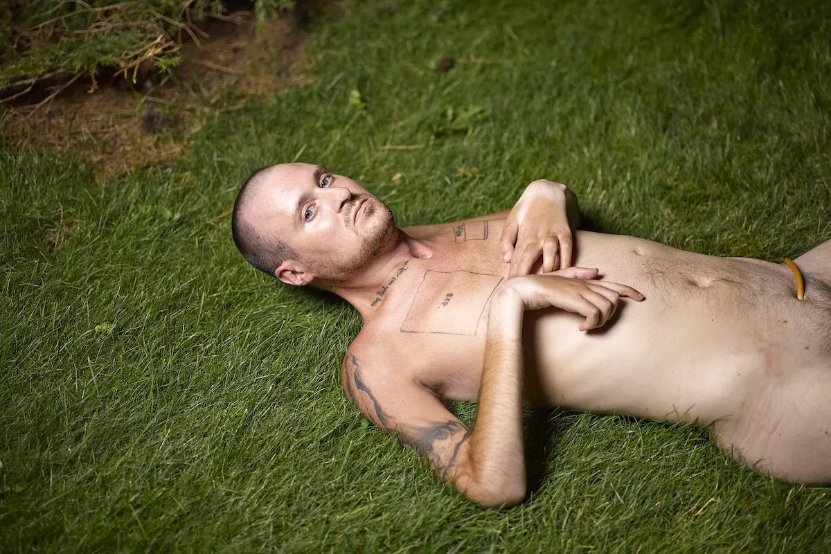 “CripFag” is an ongoing series, and Coombs scales the work in two directions: zooming out in a return to nature among the matted green grass and lush conifers reminiscent of his youth while also focusing the camera on himself, inviting the viewer into his home, bedroom, and bathroom. Both approaches explore themes of relationship, caregiving, fetish, and sex in their respective scenes. Coombs’ intentional gaze is persistent throughout: sometimes as the focal point of the picture, other times as an off-center reminder that he hasn’t forgotten the camera – another instrument between him and others.