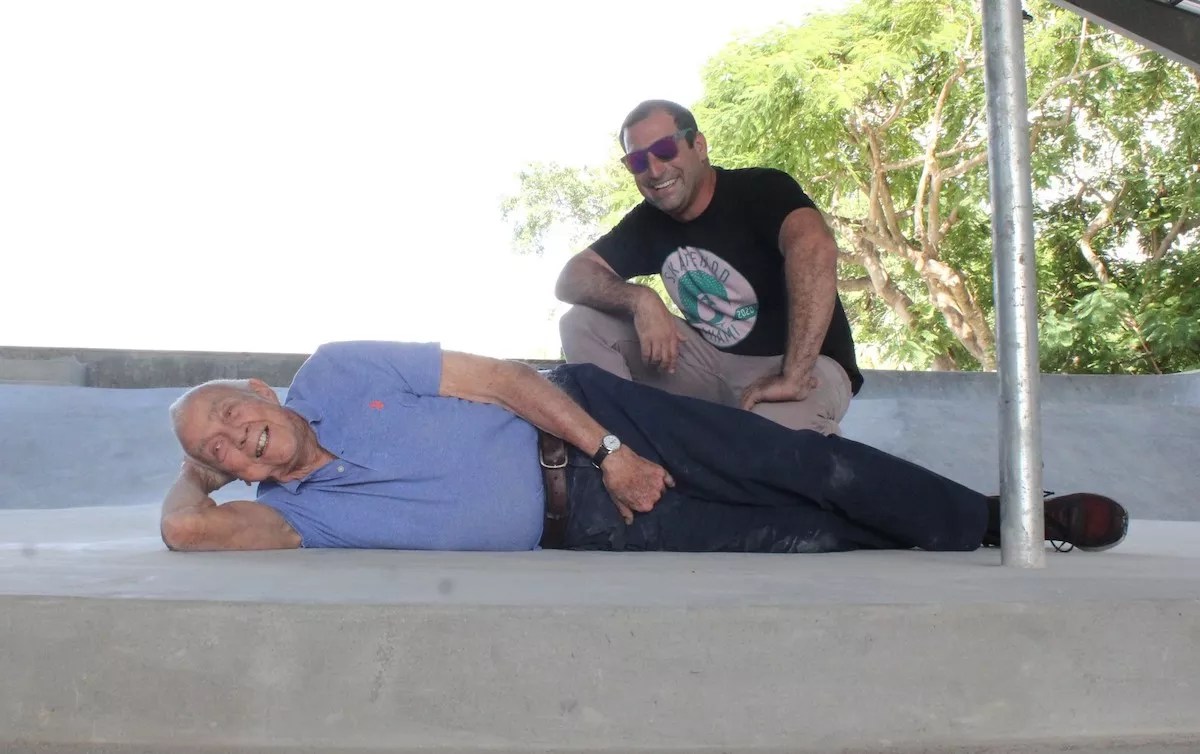 Jonathan Strauss kneels next to his landlord and longtime friend Don Bailey, 88, at SkateBird Miami. Bailey is commonly known for his partially naked flooring billboards across South Florida.
