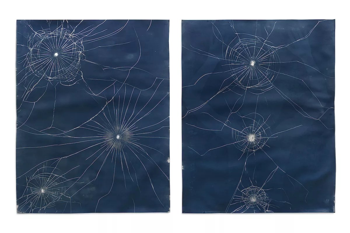 While Miami’s famously blue waters are absent from that video, they are indirectly present in her intensely blue cyanotype photograms, created when paper is treated with photosensitive chemicals and exposed to sunlight. Wright’s photograms bear white clusters of circular lines, echoing the sheet of glass she placed over each paper, then slammed with a hammer before exposing it to sunlight.