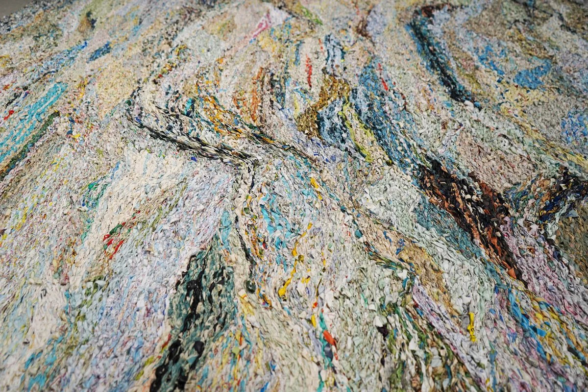Every abundant offering has a story behind it. The landline telephones all belonged to the late father of one of Phillips’ friends (who found a phone in every room of his home after he died). The tapestries that hang throughout the space are made from carpets cut and pasted together to create group portraits. There’s even a piece that Phillips has kept rolled up in a corner, unsure of whether to include it in the show. She unrolls the item, a collaborative work with artist Mary Babcock, which is made entirely of roadmaps woven together into a massive ridged collage of colors and cartographical elements. The maps, collected from friends and friends of friends, were found in a warehouse, having seemingly been abandoned.