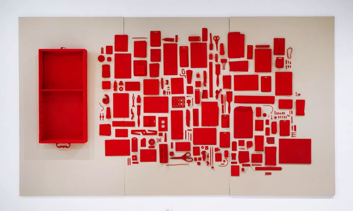 The careless nature of junk itself takes on a new meaning in a wall display of red spray-painted items that Phillips has laid flat and flocked – “flocking” being a process in which millions of synthetic or natural fibers are attached to a surface.