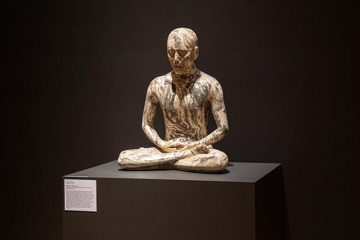 As the country reckoned with the consequences of its use of nuclear power, Kondo reckoned with the disaster through his artistry, beginning his “Reduction” series that same year. He created 20 full-body casts of his likeness seated in Zen meditation. One of these statues forms the centerpiece of the Lowe Art Museum’s latest exhibition, “Transcendent Clay – Kondo: A Century of Japanese Ceramic Art.”