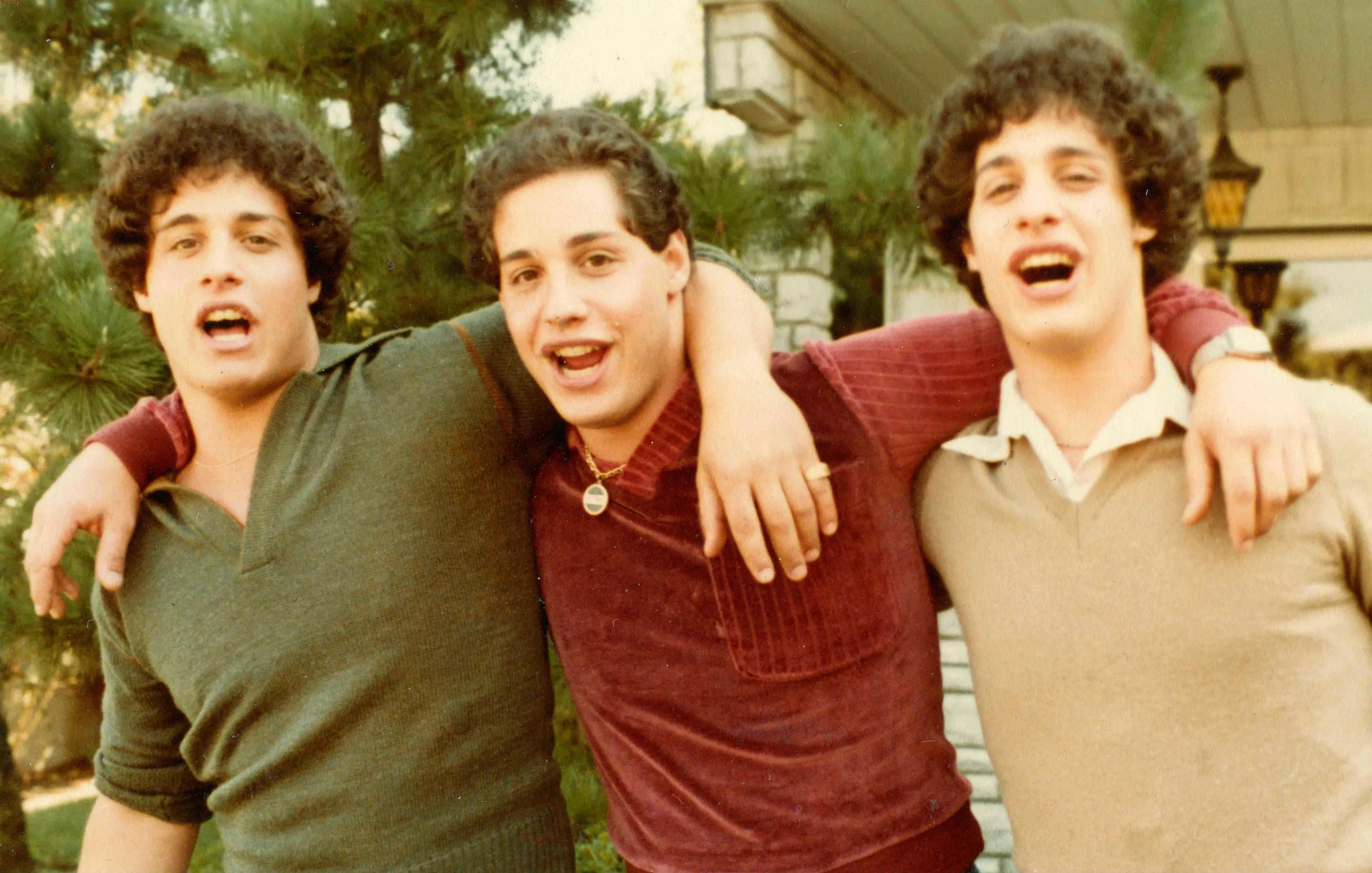 A fellow student, starting to realize what’s going on, grabs Robert and drives him to the Long Island home of 19-year-old Eddy Galland – and Robert comes face to face with himself. Or rather, his exact doppelganger. Eddy and Robert, it turns out, are identical twins, separated at birth, now brought together by an amazing coincidence. So, they get newspaper stories written about their startling reunion … whereupon a third person shows up: David Kellman of New York City. Now there are three identical young men – triplets, each of whom was apparently sent to a different home by the same adoption agency, without any information given to their new families about the existence of the others.