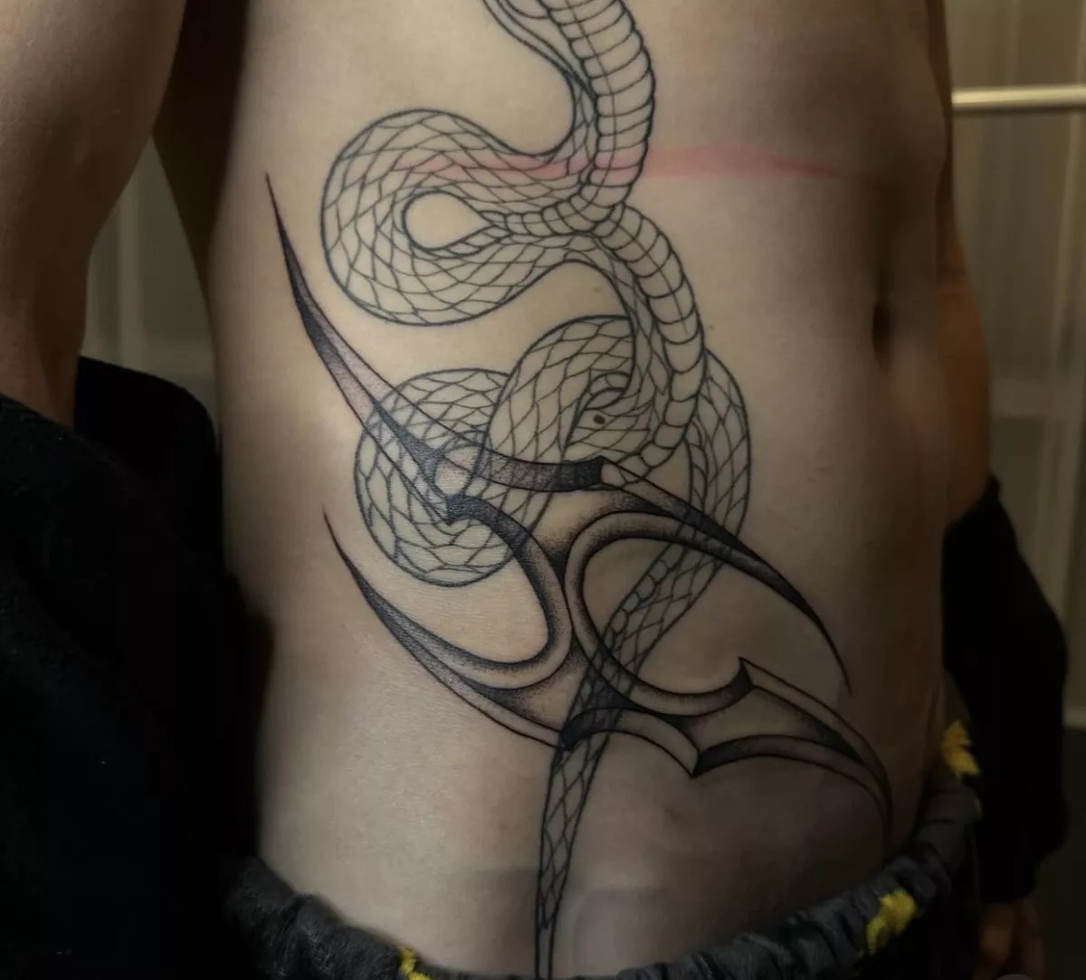 Despite the lengthy interconnectedness of femininity and autonomy with tramp stamps, anyone, regardless of their identity, can sport one. In fact, some of Sanic’s male clients have commissioned a reverse tramp stamp – or a tattoo on the lower abdomen. Using designs evocative of tribal tattoos and other masculine Y2K imagery, the location provides ample space like the lower back would and allows the artist to make a piece unique to the client’s body.