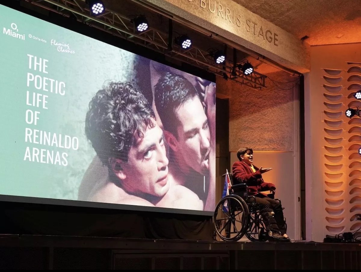 Drag artist Bad Papi performs before a screening of The Poetic Life of Reinaldo Arenas at the Miami Beach Bandshell.