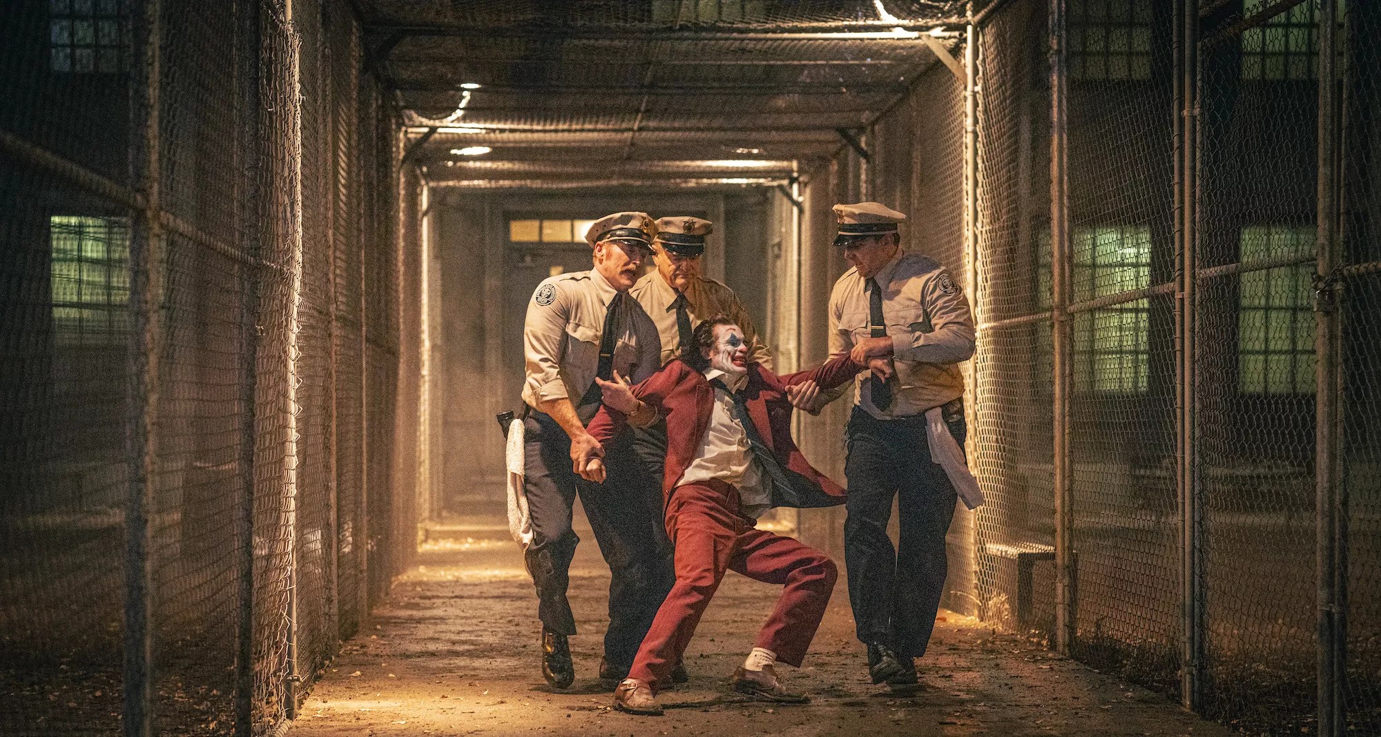 Of course, there’s some romance and conflict there, but what is most shocking about Folie a Deux is just how simple it all is. The film is, ultimately, just about a court case. It is constantly distracted, to be sure, often indulging in scenes of Arthur and his fellow prisoners either sitting around doing nothing, occasionally singing, or being harassed by guards. Familiar faces like Harvey Dent and courtroom cameos from characters that existed in the first film pop up sometimes to remind you that this is a DC property and that Joker was a movie that happened, but the film exists in perpetual limbo, unsure what time or place or vibe it wants to give off. It has no interest in creating any kind of believable universe, be it a fantastical or insane one like Arthur’s supposed mental state or one that cuts right through the bullshit and focuses on reality. Instead, it fixates on casually bringing up a ton of its supposed inspirations.