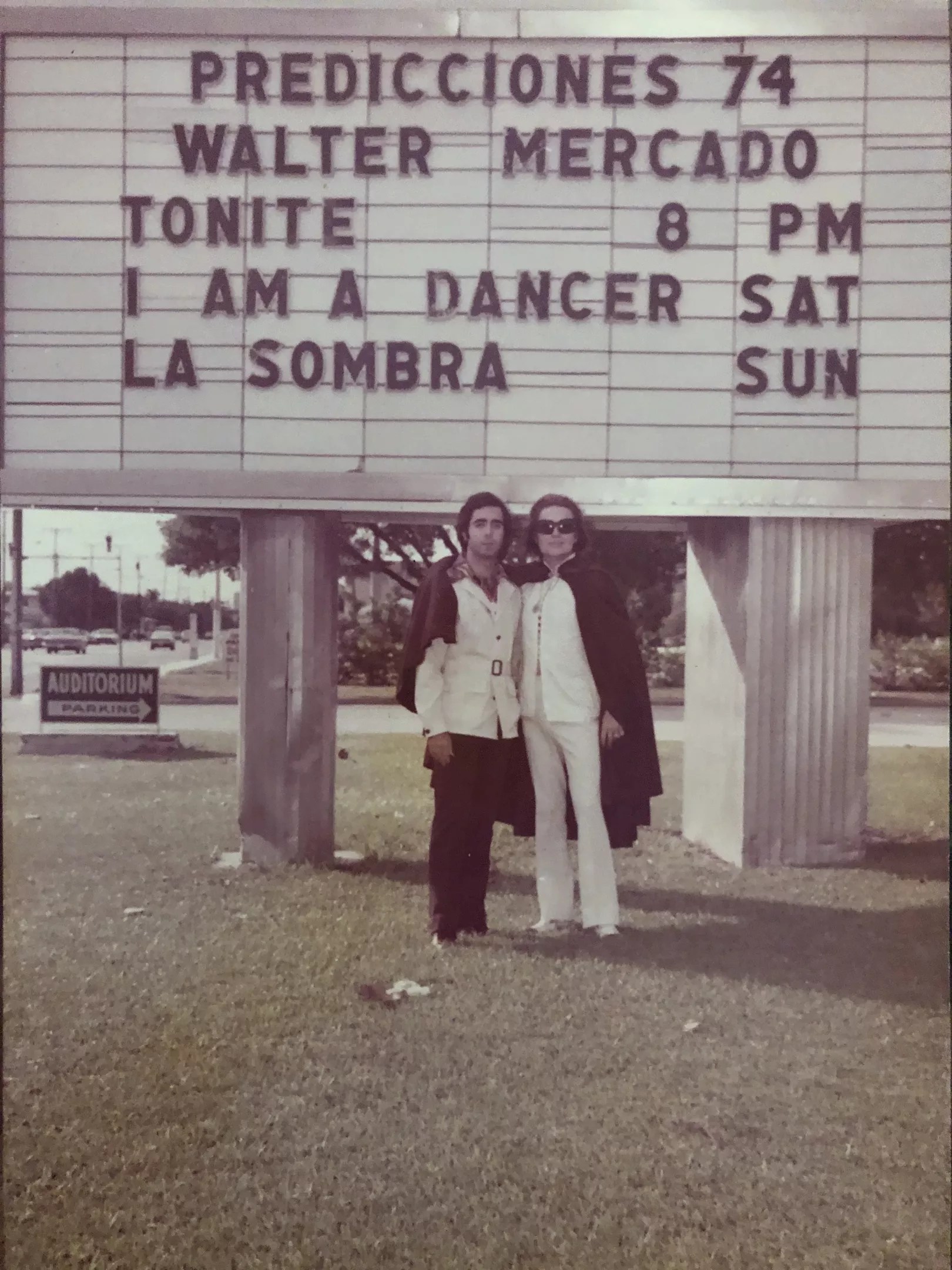 In another sepia-toned photo, my dad and Mercado stand beneath a large marquee at Dade County Auditorium that reads, “Predicciones 74, Walter Mercado, tonite 8 pm.”