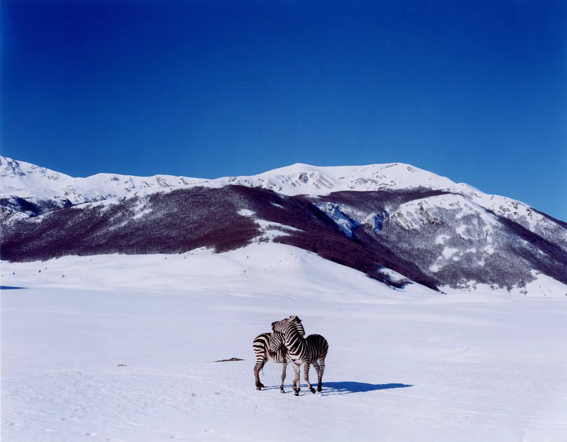 Guests can also view fantastical works such as a wall of mechanized spinning bicycle wheels accented with a single avian feather, like that of a peacock, turkey, or ostrich. They’ll see a photograph of two zebras on a snowy mountainside, a stuffed musk ox leg-deep in a pile of coffee beans, and a