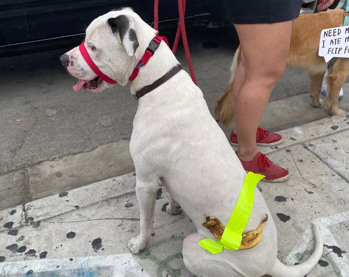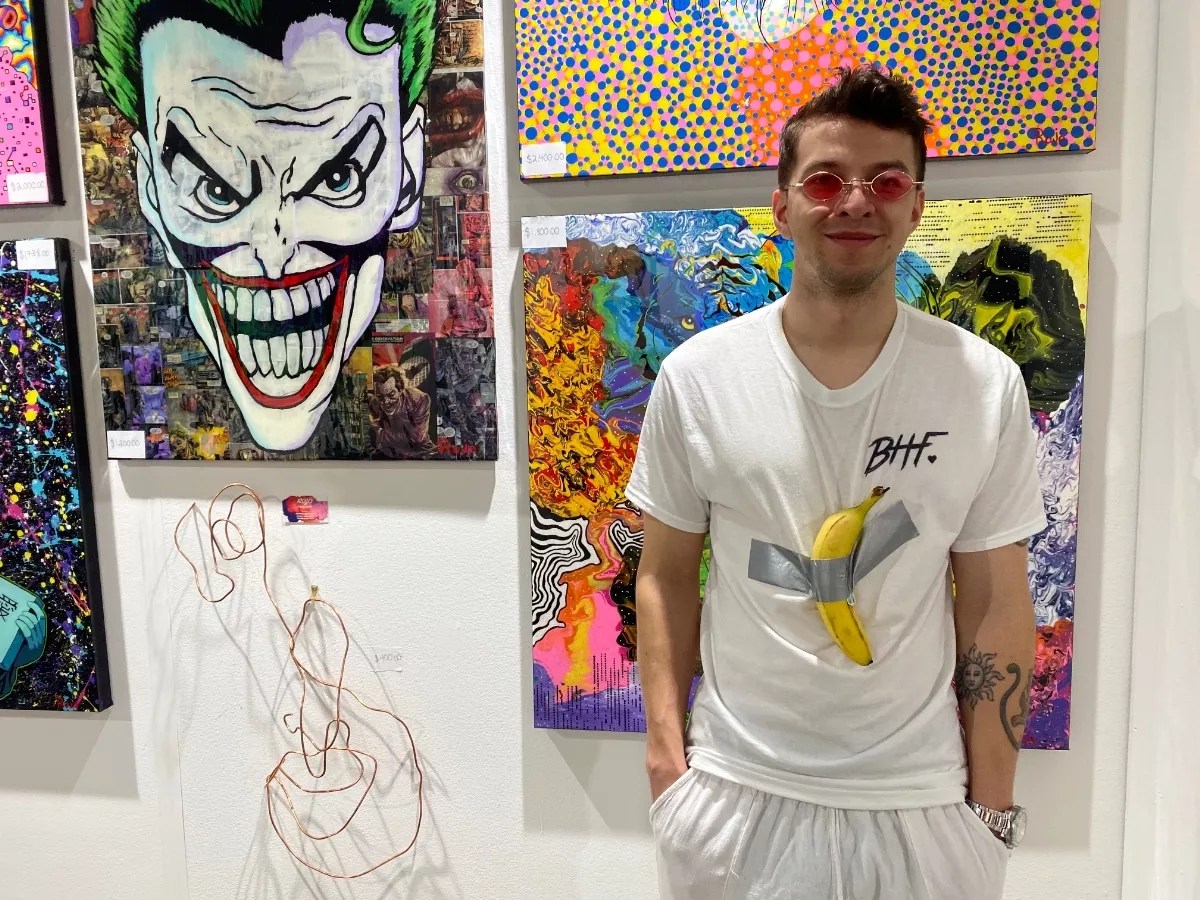 At the art show Red Dot/Spectrum, Rojo the Artist turned himself into a canvas for his banana art. Known for his mixed-media pop-cultural pieces, the artist is using fruit and human for the first time, however. Coco displays banana art (dog not included). Photo by Laine Doss