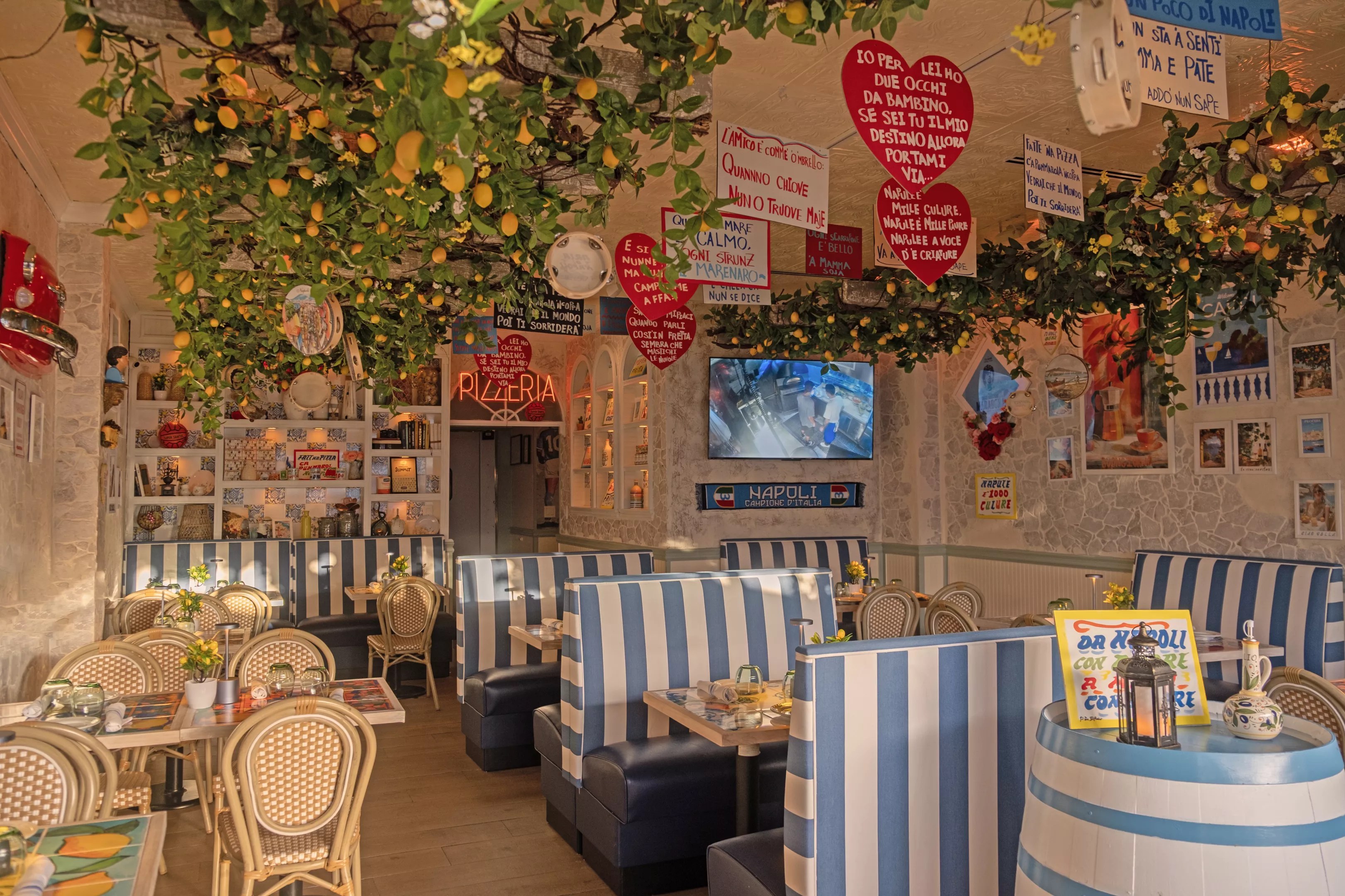 The restaurant’s design leans into Naples’ playful, slightly kitschy aesthetic. Hand-painted signs dangle from the ceiling with famous Neapolitan sayings about love.