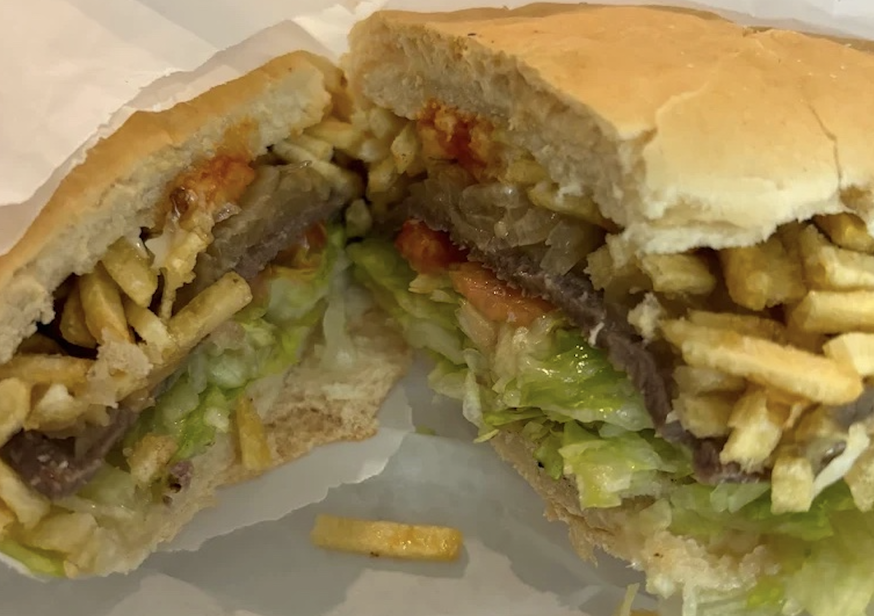 Legendary Miami cafe and laundromat Mary's Cafe and Coin Laundry serves one of the best pan con bistec sandwiches in South Florida, served with crispy potato sticks.