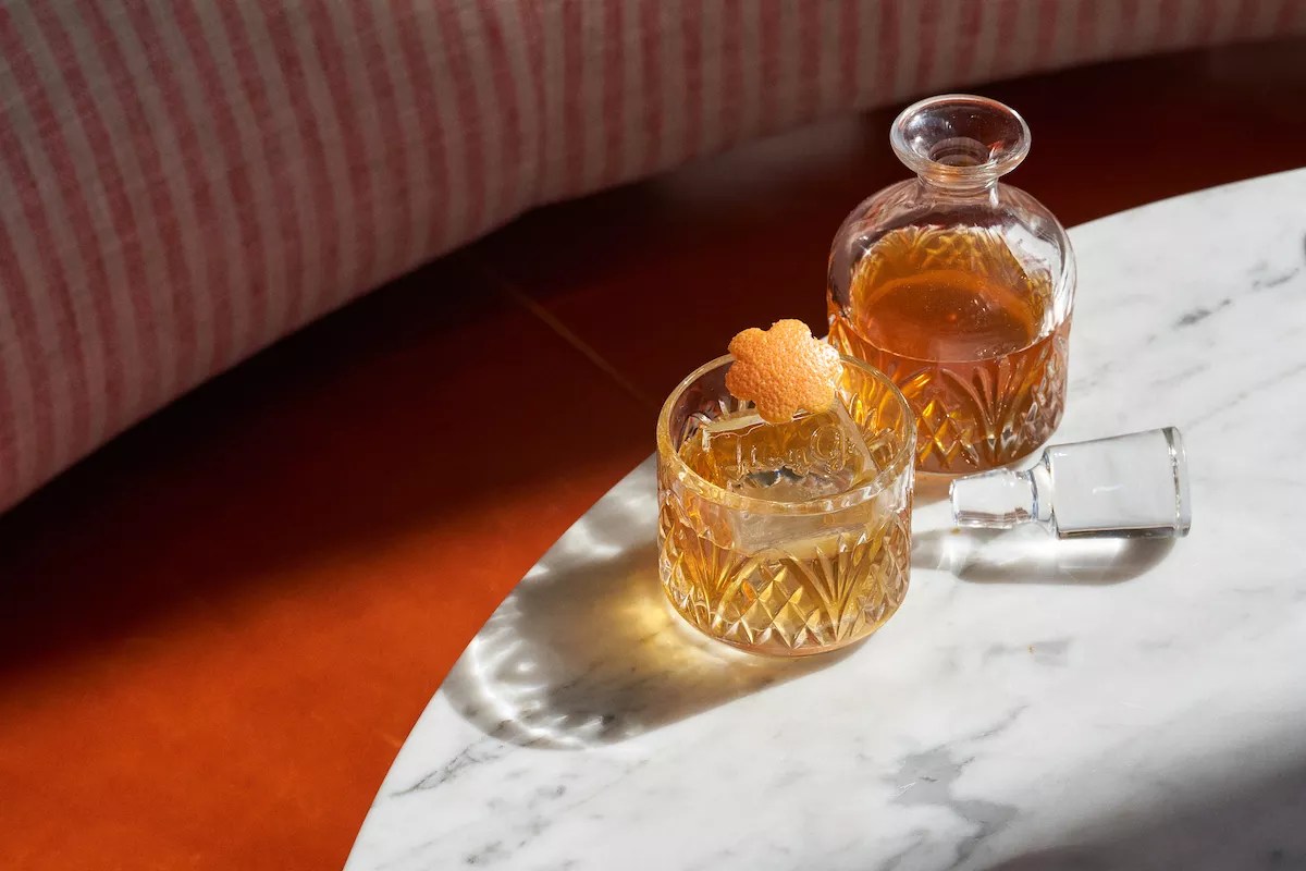 The heady combination of Aberfeldy scotch whisky, fino sherry, strawberry, and raspberry is married with gentle notes of steeped rose tea, sage, and cacao and a touch of citrus to pull the tannins and clarify the liquid. It’s poured into a goblet-sized glass with a single cube, served on a wooden board with dried rose petals and smudged, smoking sage.