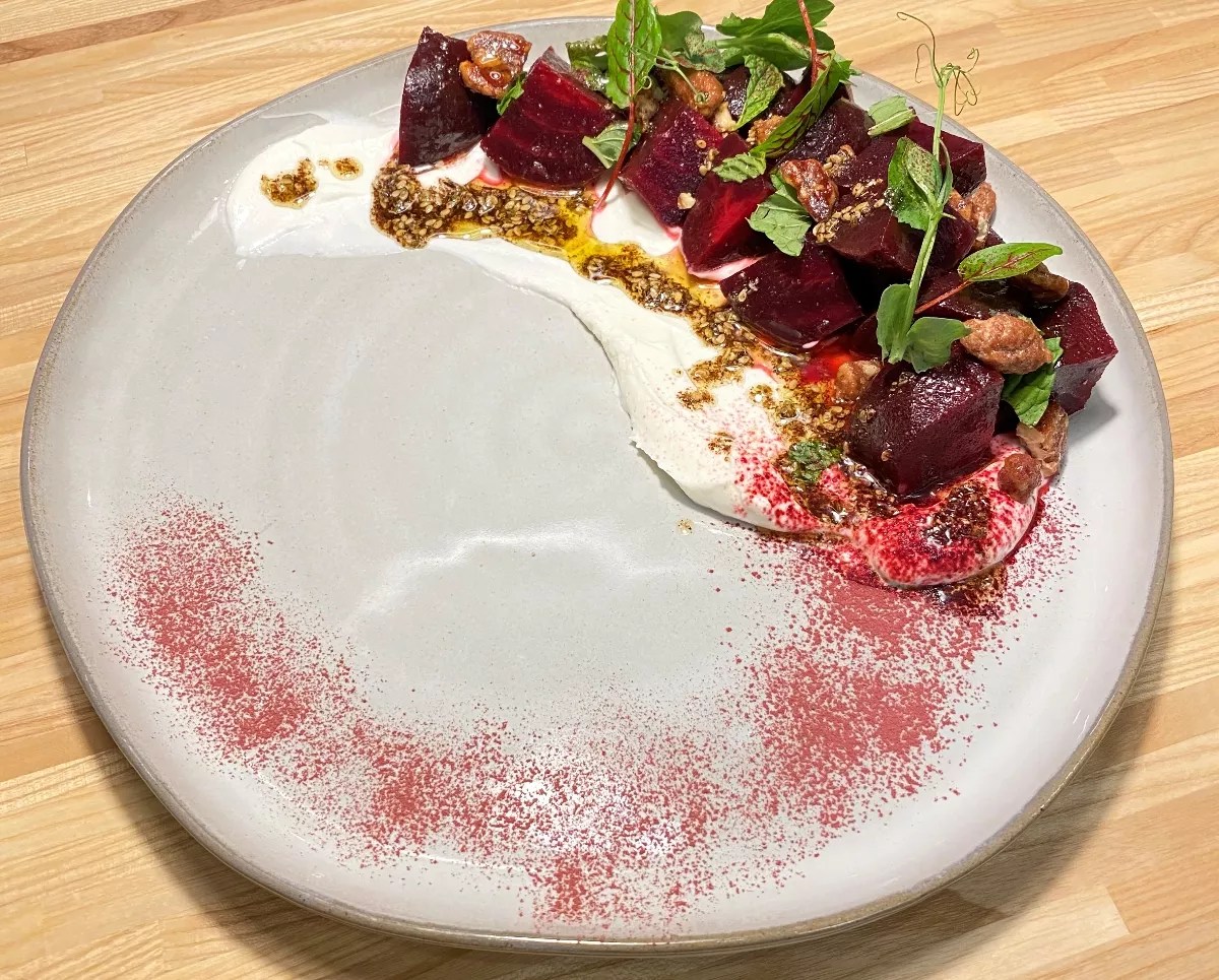 Menu items include pan con tomate topped with white anchovies ($9), roasted beets prepared with Greek yogurt, zaatar, glazed pecans, and mint ($14), a spicy pancetta pizza topped with mozzarella, calabrese peppers, pomodoro sauce, and honey ($14), and pappardelle tossed with littleneck clams and white wine garlic sauce.