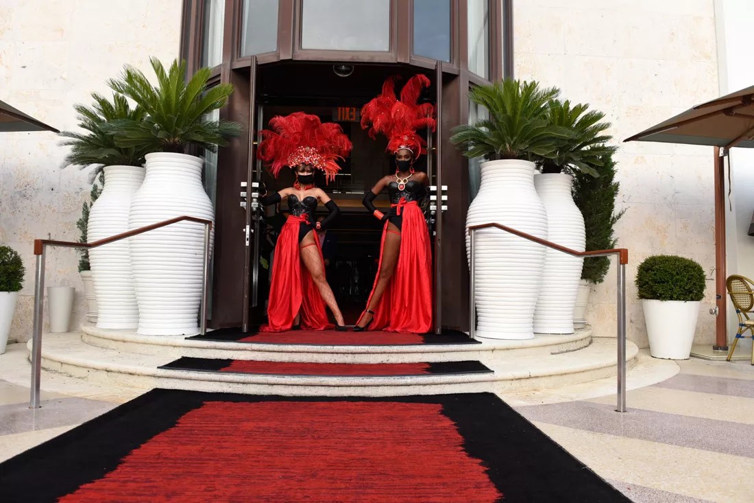 At the SLS South Beach, a red carpet leads upstairs to the entrance of the Bazaar by José Andrés, where a pair of models costumed as Las Vegas showgirls stand by to greet guests.