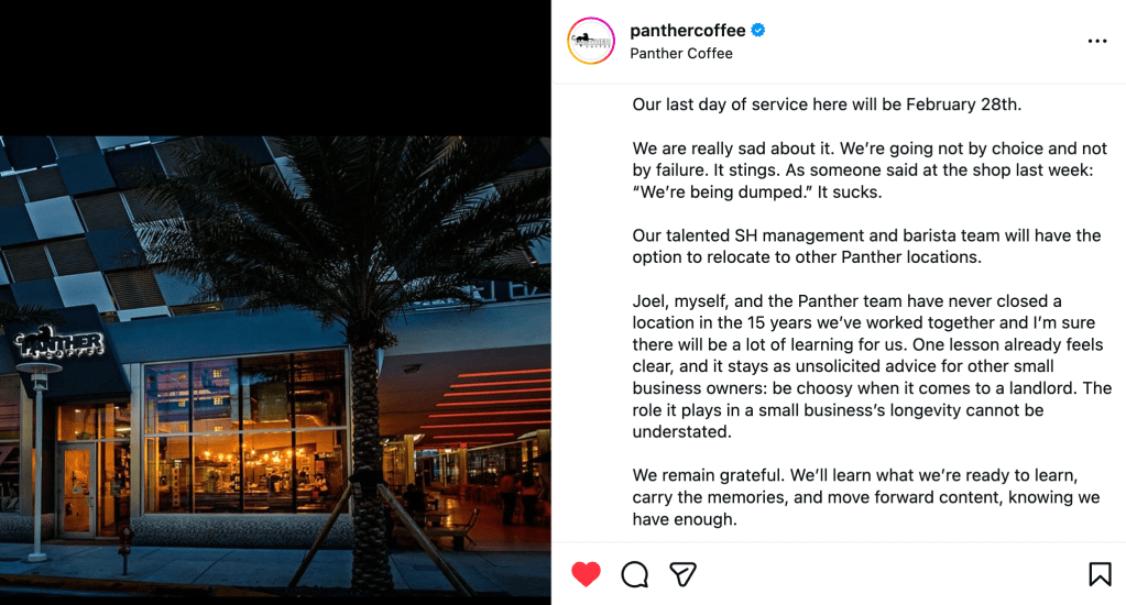 For founders Joel and Leticia Pollock, closing a store is uncharted territory. “Joel, myself, and the Panther team have never closed a location in the 15 years we’ve worked together,” the post reads, noting that one early lesson stands out: “Be choosy when it comes to a landlord. The role it plays in a small business’s longevity cannot be understated.”